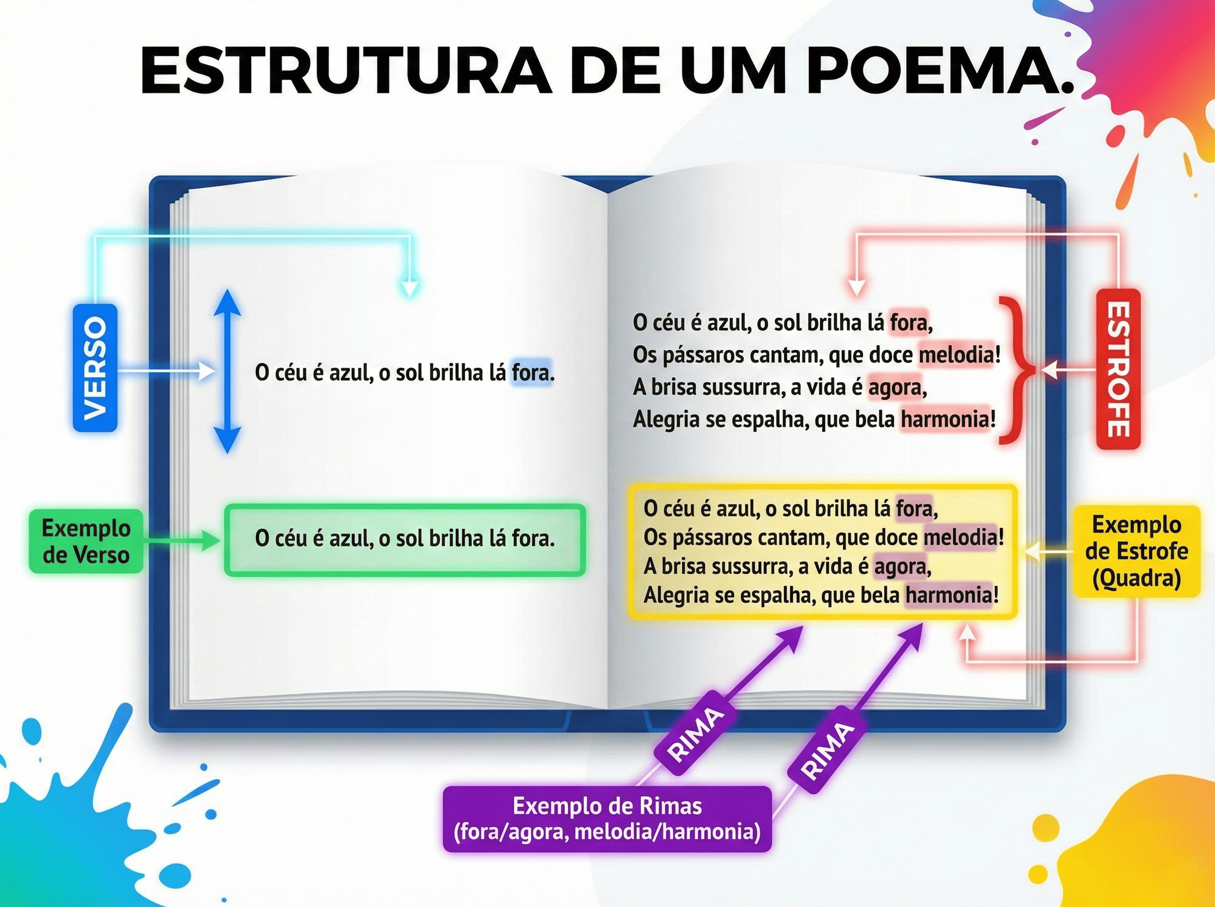 Infografia didática da estrutura de um poema: versos, estrofes e rimas