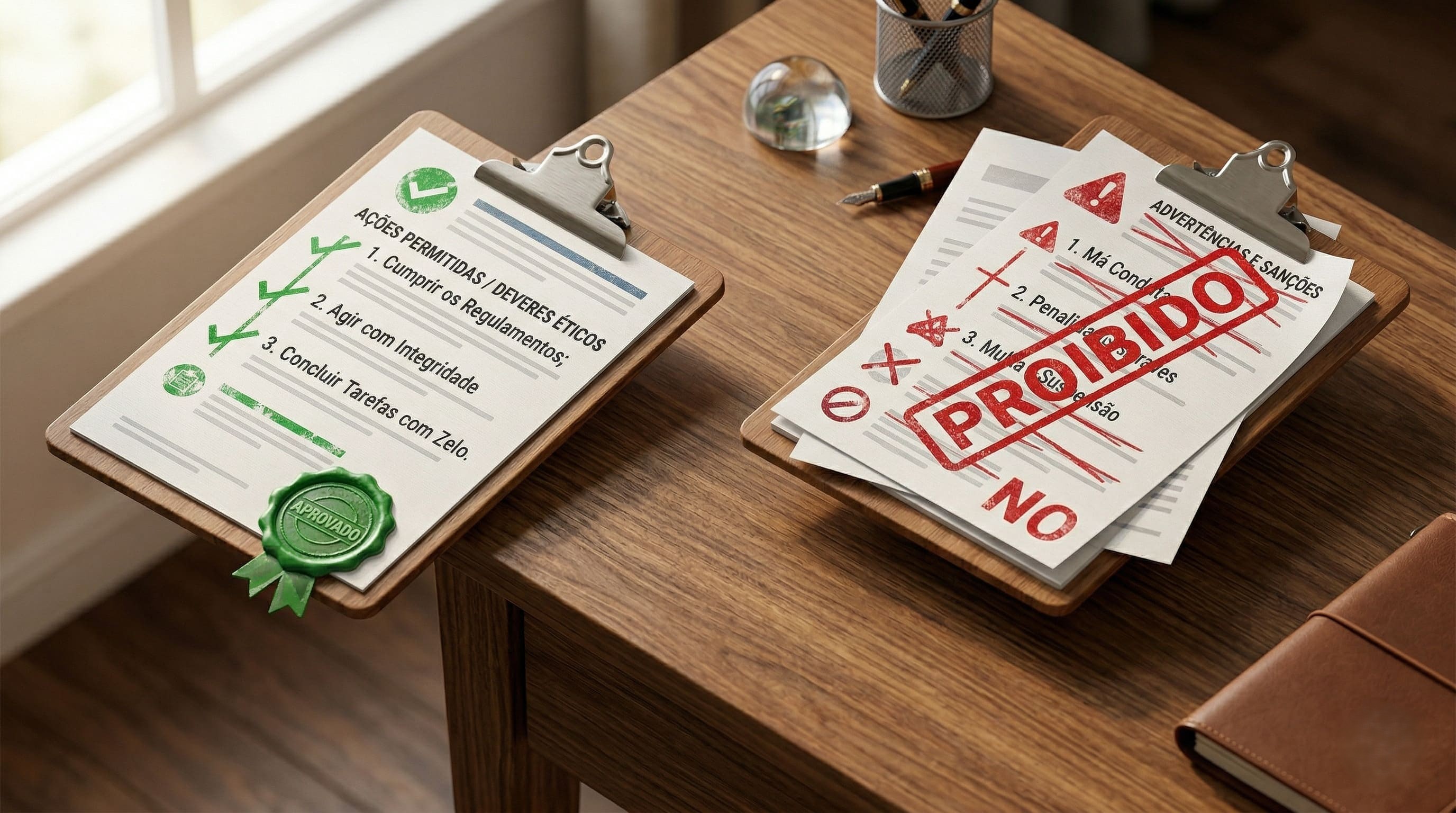 Alt Text: Representação gráfica de um documento oficial com um selo de aprovação em verde listando ações permitidas, e um documento com um carimbo vermelho de 'Proibido' listando advertências e suspensões.