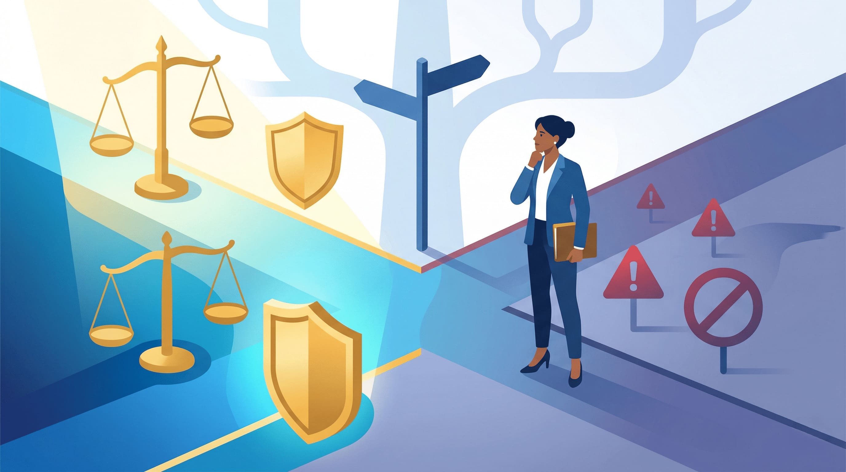 Alt Text: Ilustração de um servidor público em uma encruzilhada de decisões, de um lado um caminho iluminado com um escudo e uma balança representando os deveres, e do outro um caminho escuro com sinais de alerta representando as proibições.