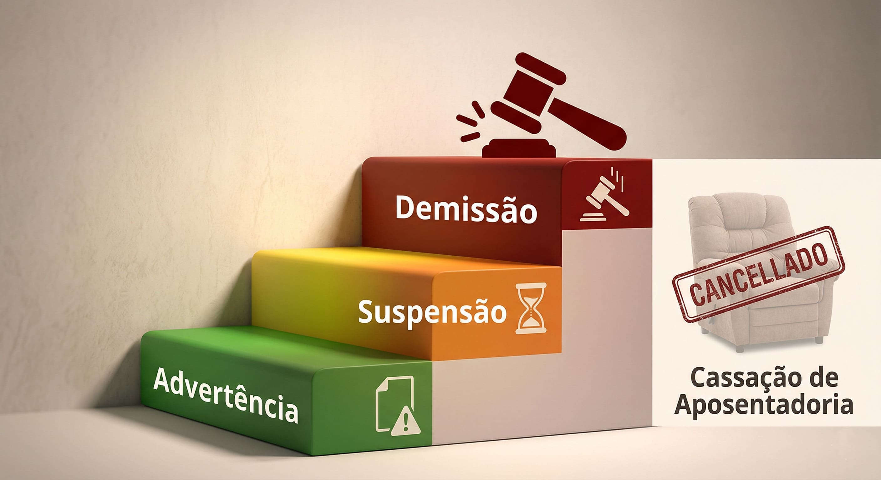 Alt Text: Ilustração de degraus subindo em nível de gravidade, do verde ao vermelho escuro. O primeiro degrau diz Advertência, o segundo Suspensão, e o topo Demissão, com um carimbo de cassação de aposentadoria ao lado.