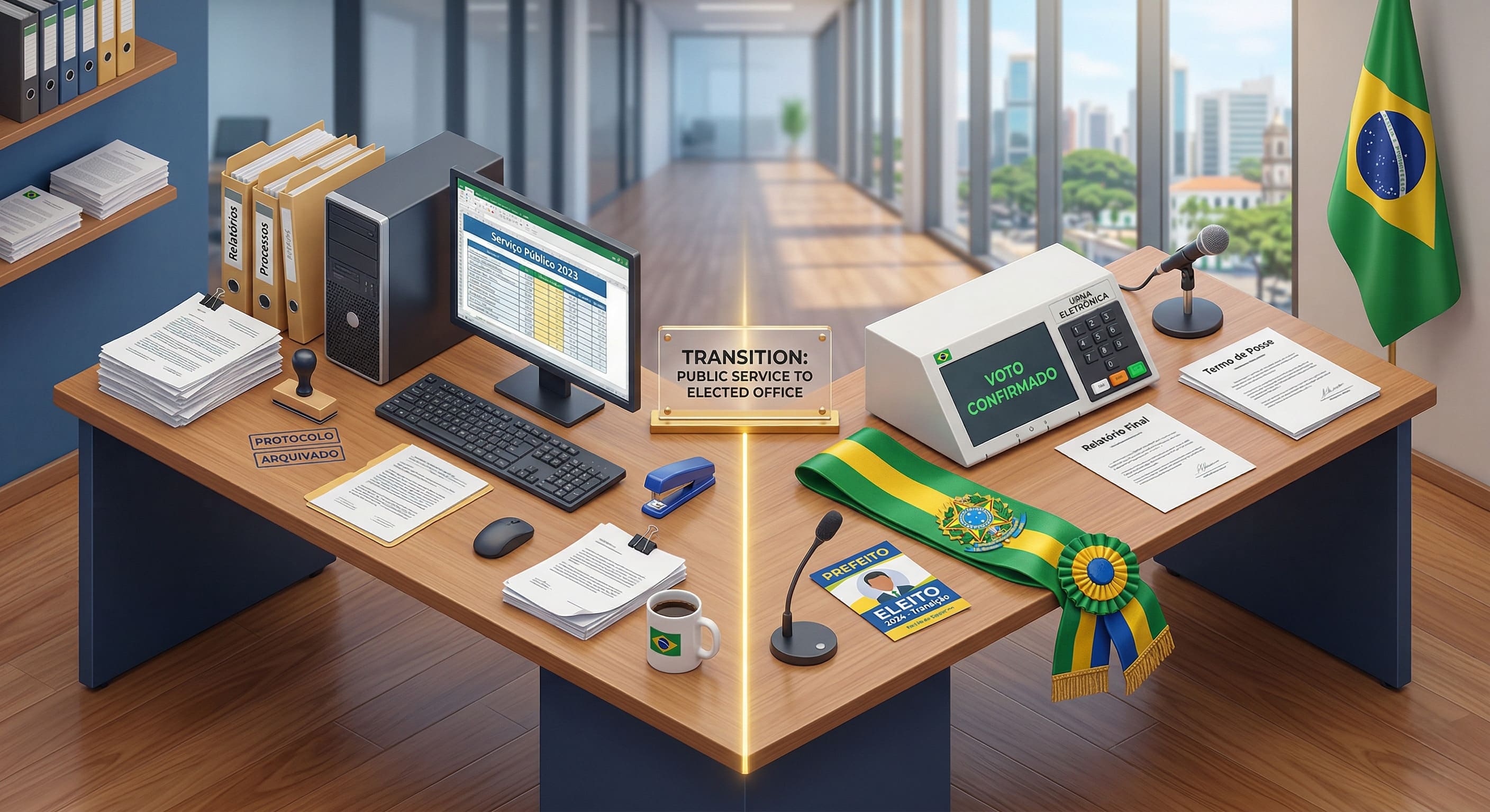 Alt text: "Ilustração 3D isométrica de uma mesa de escritório dividida ao meio: de um lado, papéis, carimbos e um computador de servidor; do outro lado, uma urna eletrônica brasileira e uma faixa de prefeito, simbolizando a transição para o mandato eletivo."
