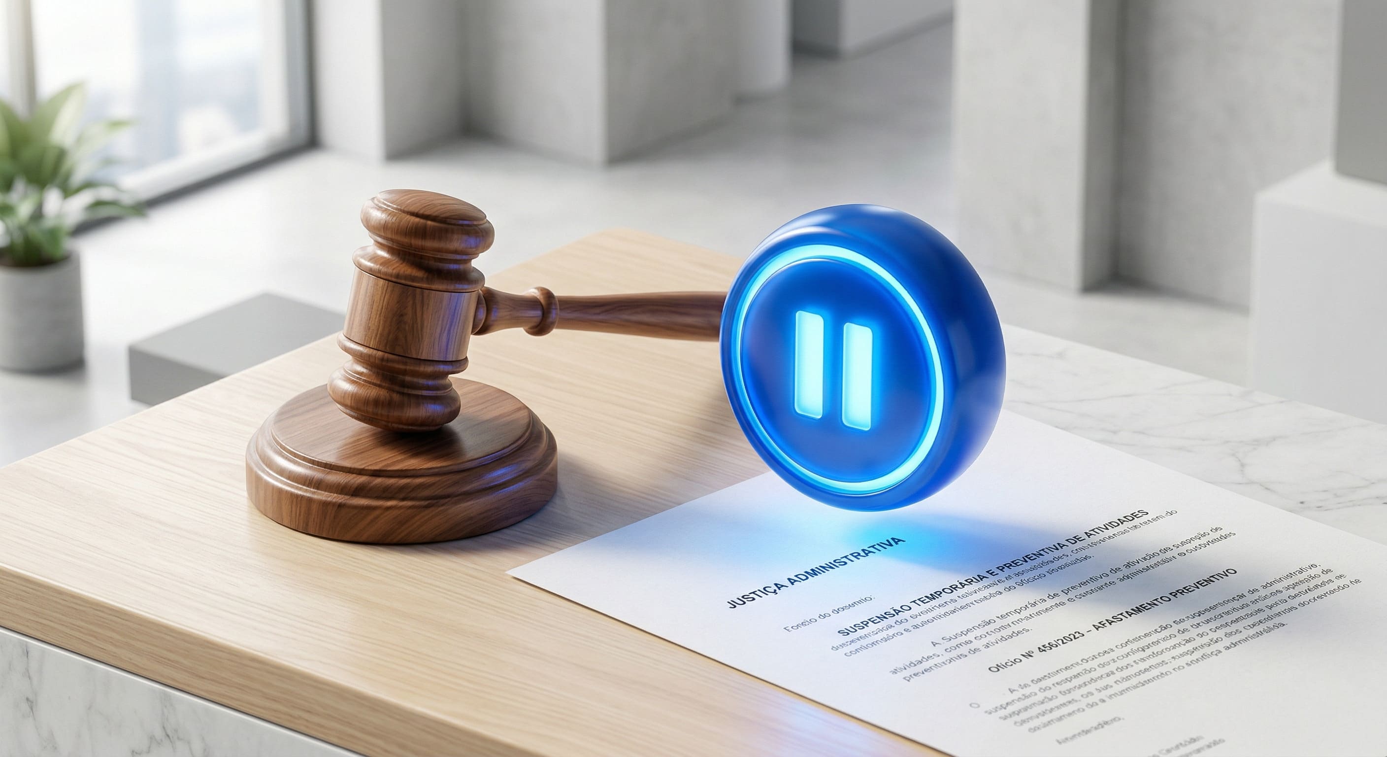 Alt text: "Ilustração de um martelo de juiz (representando a justiça administrativa) ao lado de um botão de 'pause' iluminado, indicando a suspensão temporária e preventiva de atividades no serviço público."