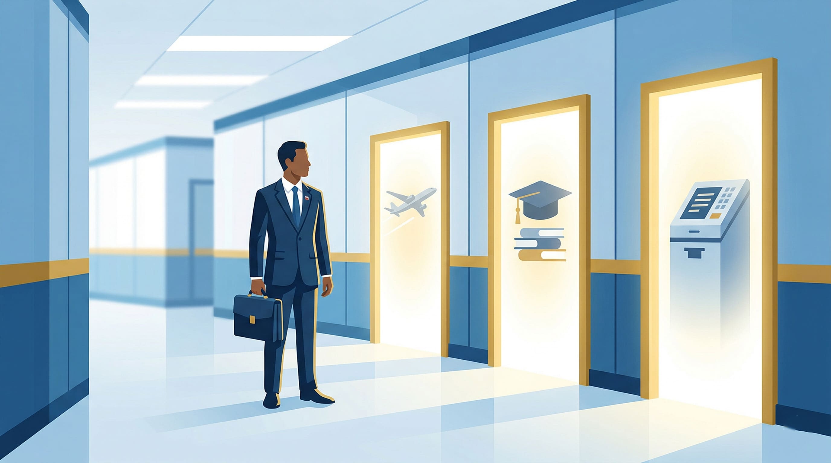 Alt text: "Ilustração moderna de um servidor público diante de várias portas brilhantes, cada uma representando um caminho diferente: uma com um avião, outra com um capelo de formatura e outra com uma urna eletrônica."