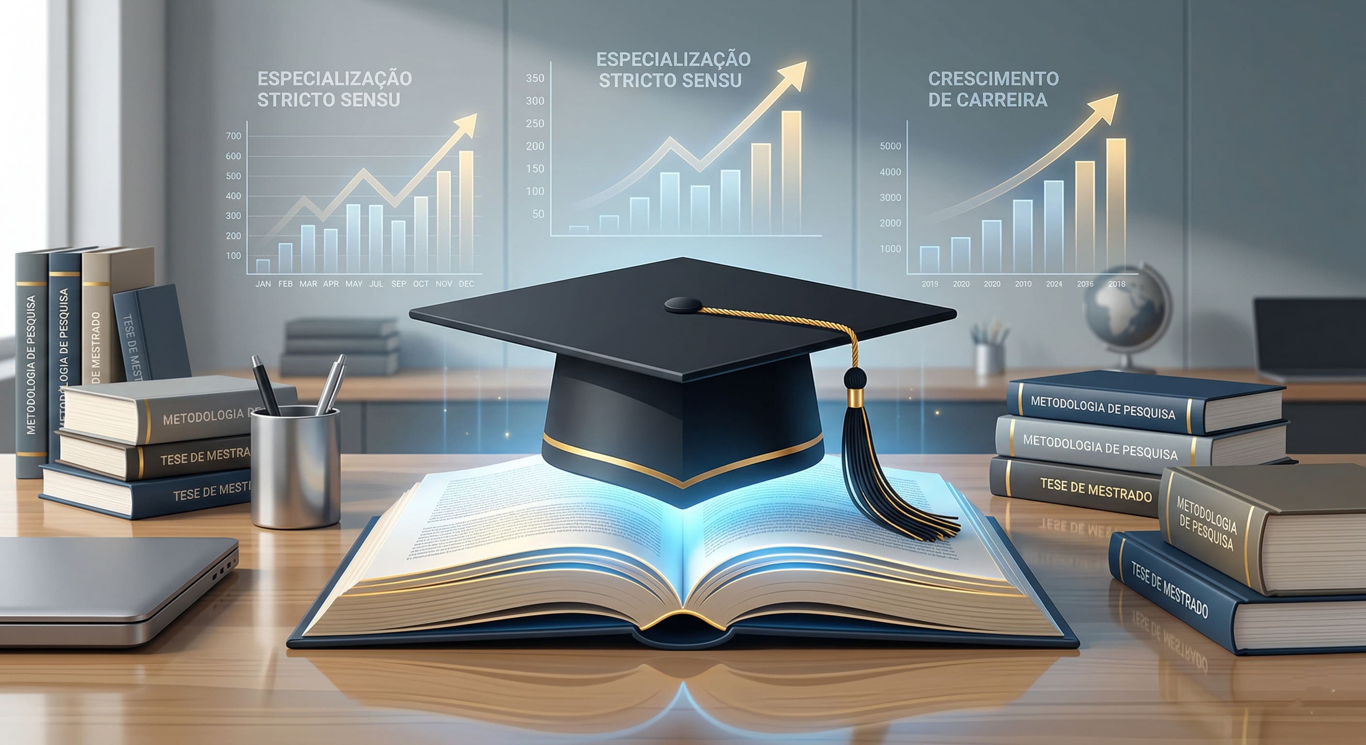 Alt text: "Imagem conceitual ilustrando um escritório de estudos avançados. Um livro aberto e brilhante está no centro, com um capelo de mestrado pousado sobre ele, rodeado por gráficos de crescimento, simbolizando a especialização stricto sensu."