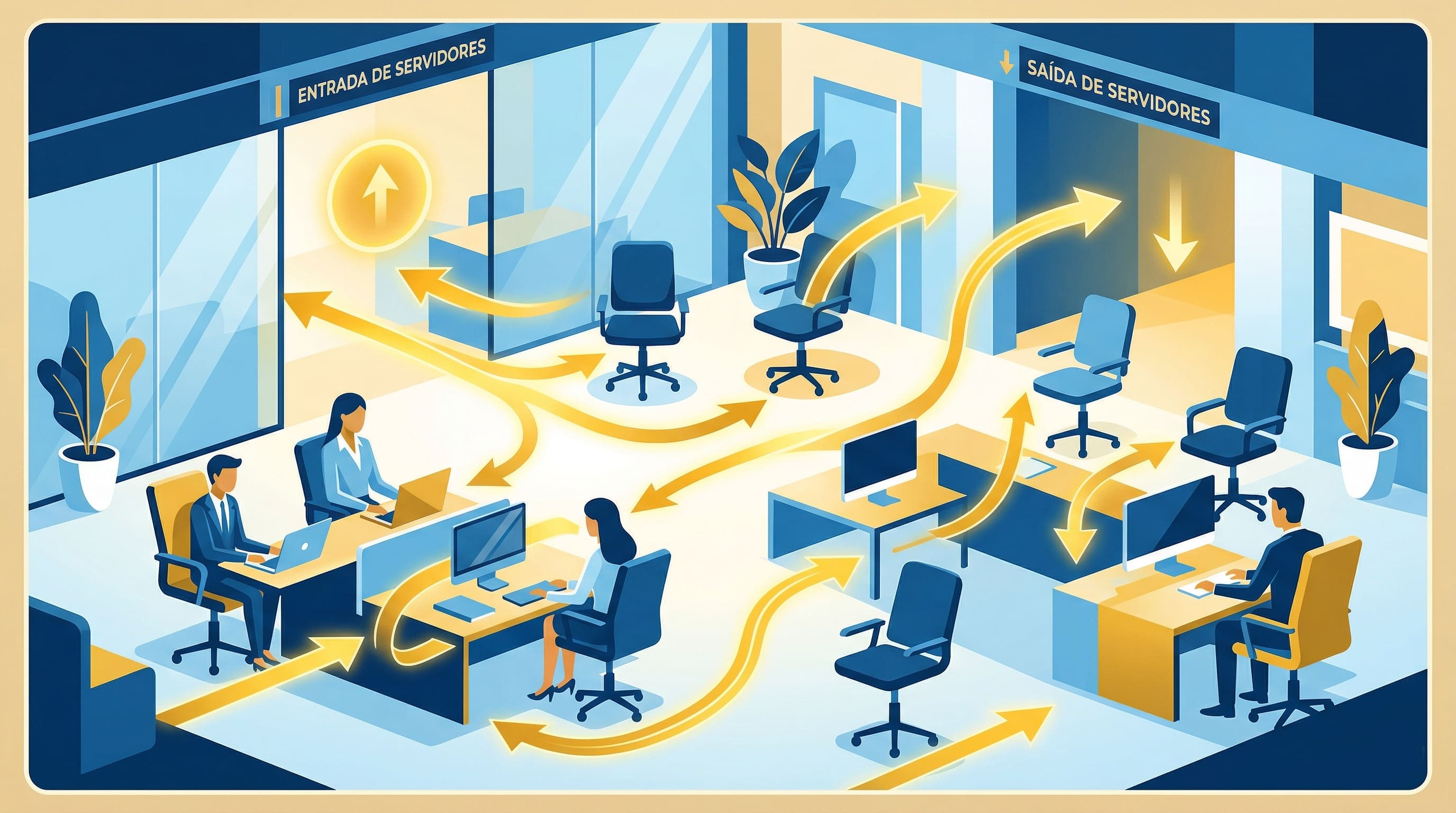 Alt text: "Ilustração moderna e conceitual representando a movimentação, entrada e saída de servidores públicos em seus cargos"