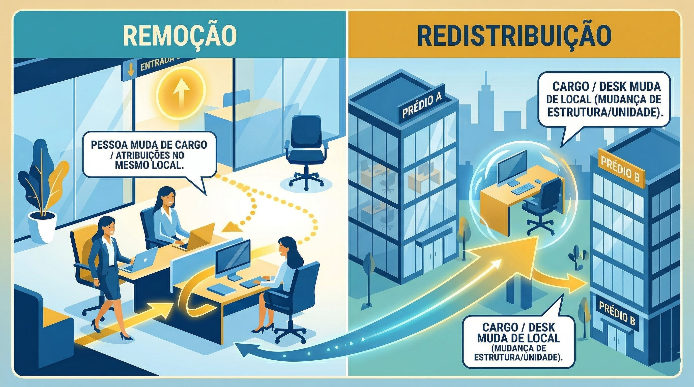 Até agora falamos de provimento (entrar ou voltar ao cargo) e vacância (sair do cargo). Mas existem institutos que não são nem uma coisa, nem outra: são formas de mero deslocamento. As duas modalidades mais famosas, e que mais confundem estudantes e profissionais, são a Remoção e a Redistribuição.
