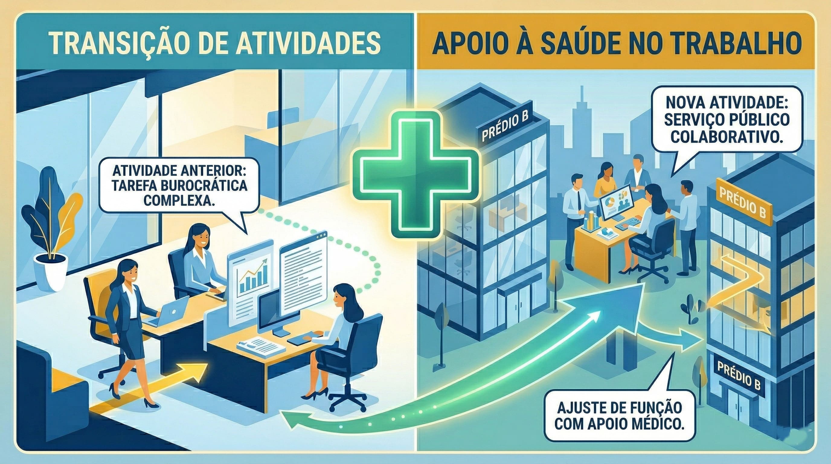 Alt text: "Ilustração mostrando um servidor público passando por uma transição de atividades com um símbolo de saúde em destaque"