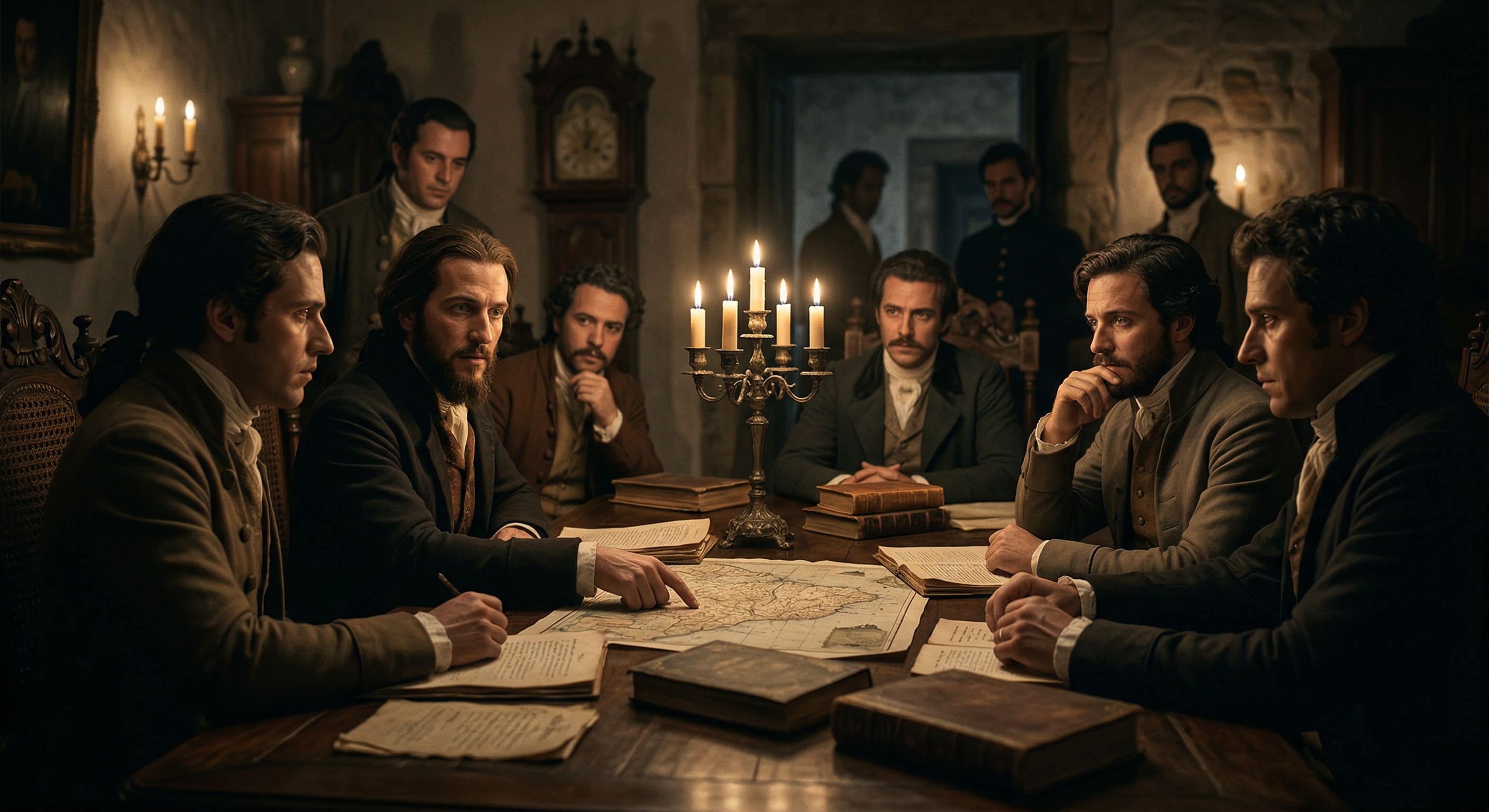 Alt Text: Ilustração histórica realista de inconfidentes, poetas e intelectuais reunidos secretamente no século XVIII em Minas Gerais, planejando a revolução ao redor de uma mesa com mapas e livros iluminados à luz de velas.