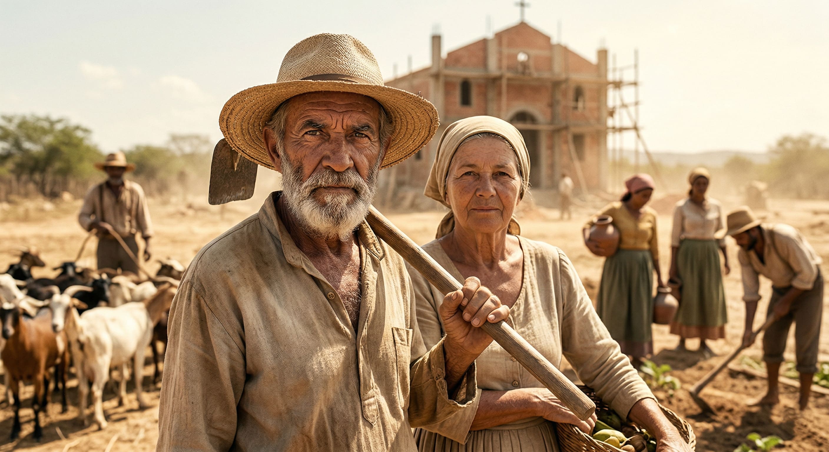 Alt Text: Representação da vida pacata e do intenso trabalho agrícola no Arraial de Canudos, focada na criação de cabras e na convivência da comunidade no sertão nordestino.