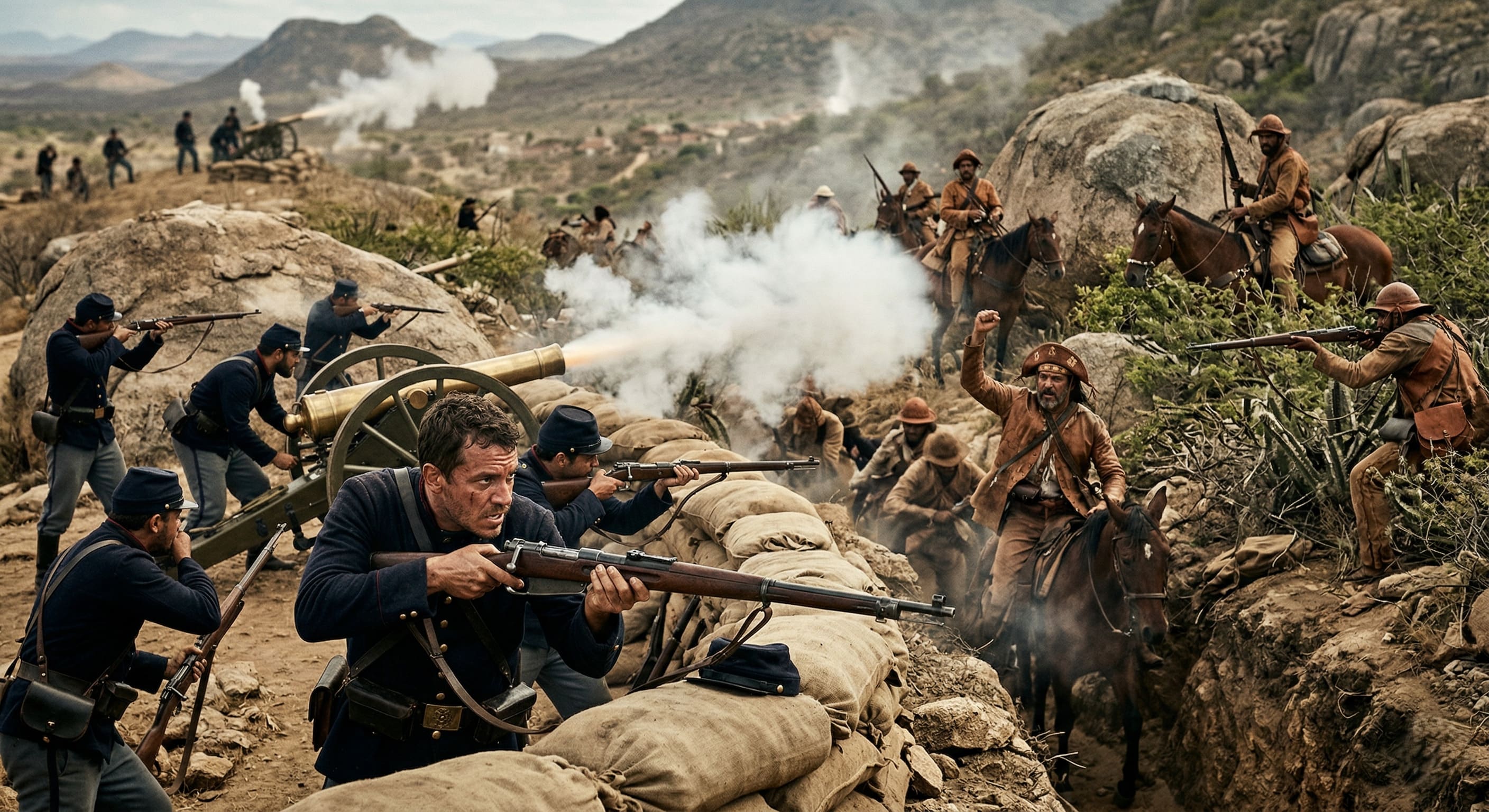 Alt Text: Batalha violenta entre as tropas oficiais republicanas e os rebeldes sertanejos camuflados na paisagem e nas trincheiras em meio às serras da Bahia.