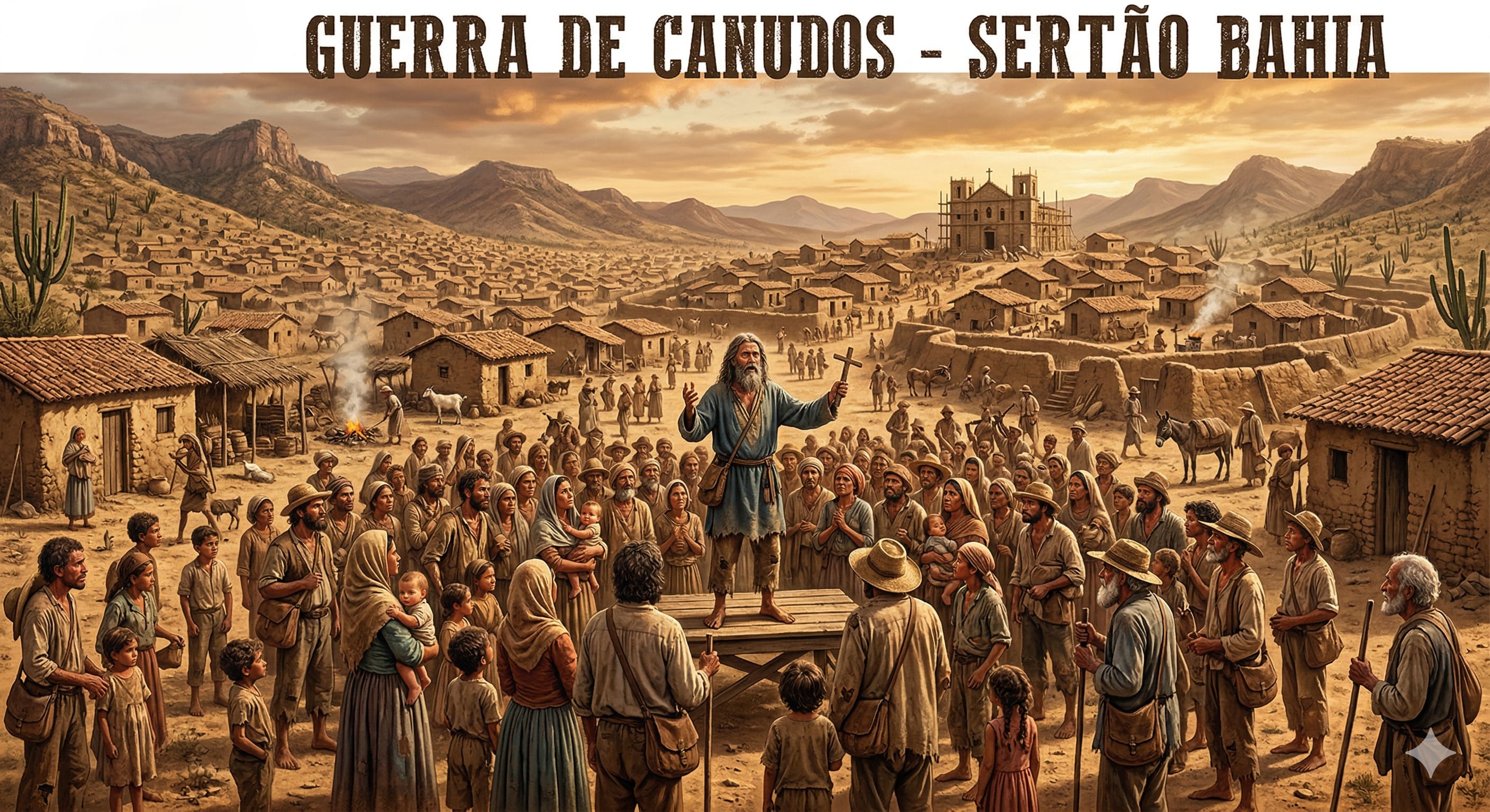 Alt Text: Ilustração realista da Guerra de Canudos mostrando o vasto arraial de Belo Monte nas montanhas do sertão baiano com famílias sertanejas e o líder Antônio Conselheiro.
