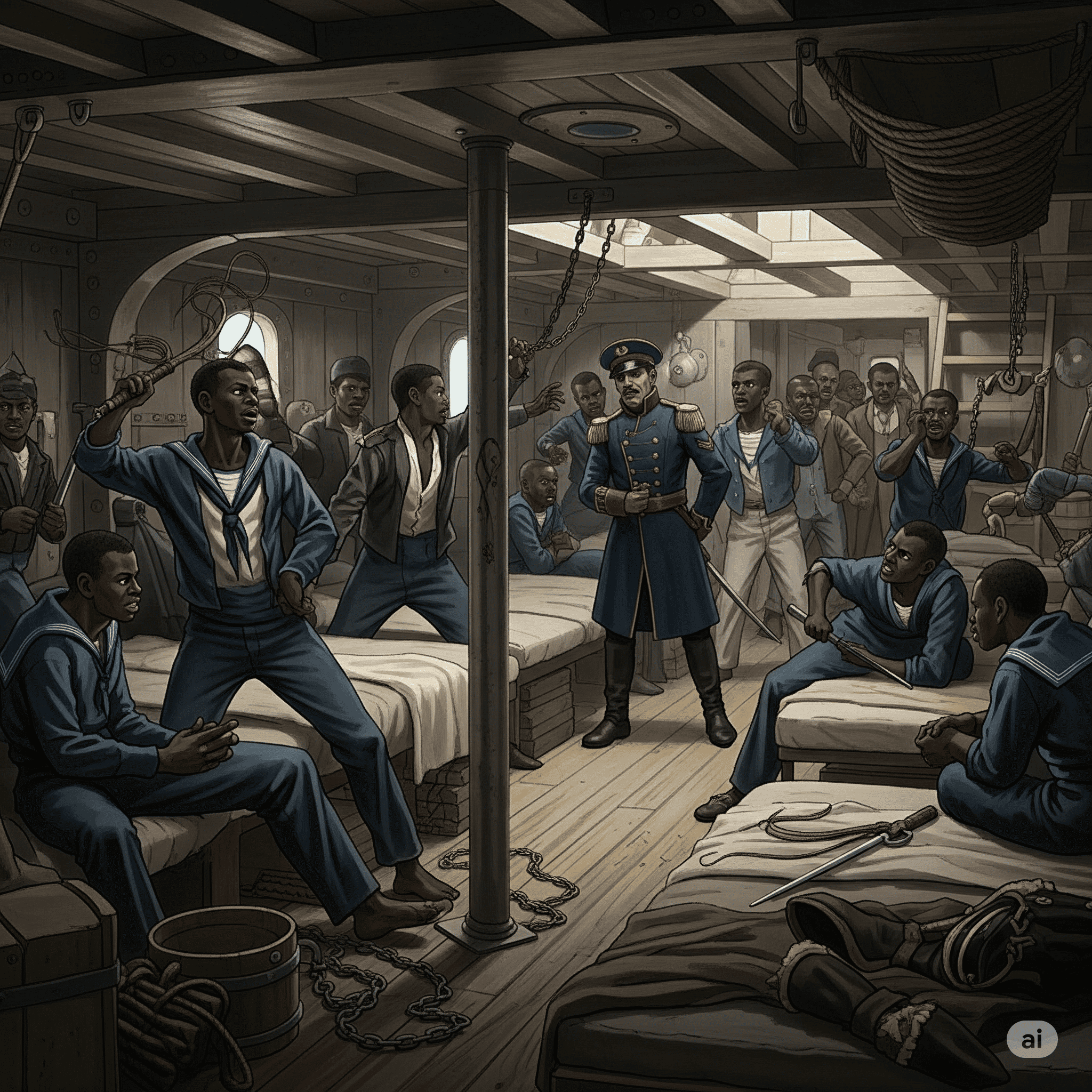 Composição Racial: As posições mais baixas da hierarquia naval eram ocupadas em grande parte por marinheiros negros e mulatos – filhos e netos de antigos escravos. Estima-se que até 75% a 90% dos marinheiros eram negros. Em contraste, o corpo de oficiais era quase que inteiramente branco, vindo de famílias abastadas que aspiravam a carreiras de prestígio como médico, advogado, engenheiro ou almirante.