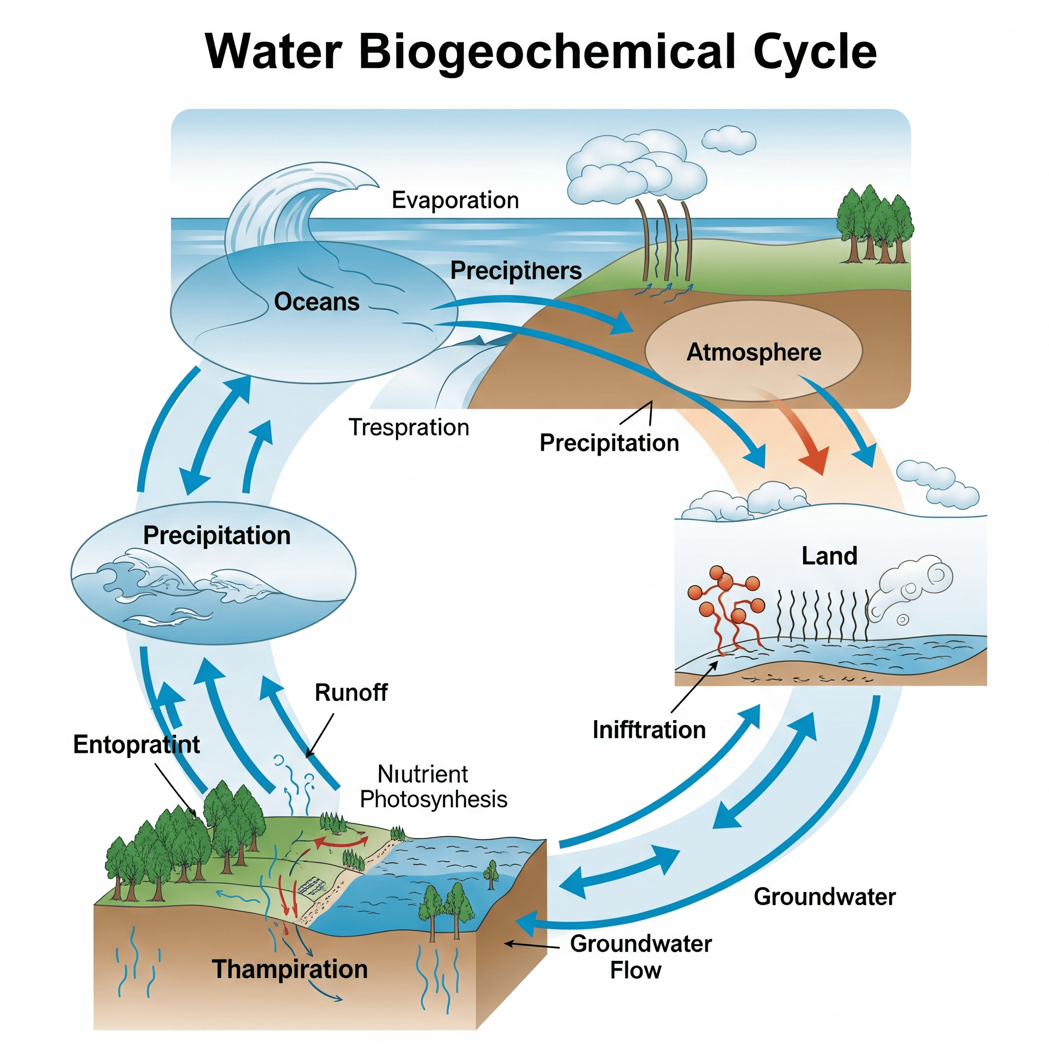 Esse ciclo é considerado um dos principais ciclos biogeoquímicos. Os ciclos biogeoquímicos são processos em que uma determinada substância se move do meio abiótico (ar, água, solo) para os seres vivos e vice-versa, garantindo a ciclagem de elementos essenciais para o funcionamento e equilíbrio dos ecossistemas. A água, sendo encontrada em absolutamente todos os seres vivos e participando de seus processos metabólicos, tem sua ciclagem fundamental para a manutenção da vida no planeta.