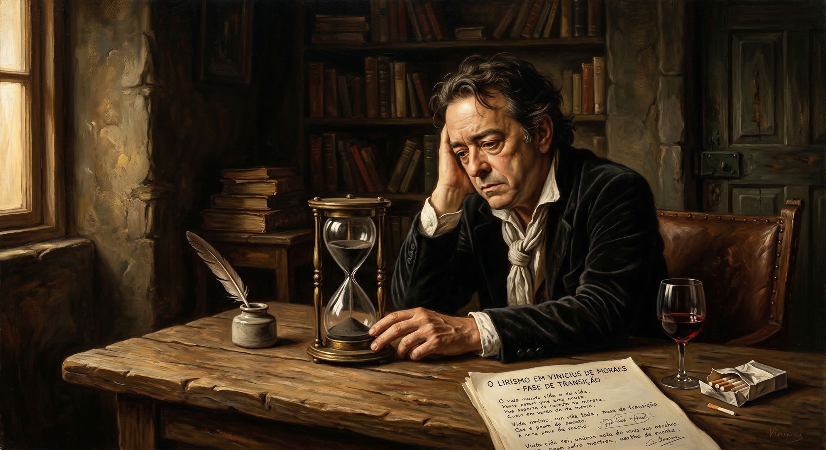 Alt Text: Imagem conceitual simbolizando O Lirismo em Vinicius de Moraes em sua fase de transição, focando na passagem do tempo, na perda do misticismo e na aceitação da vida real e terrena.