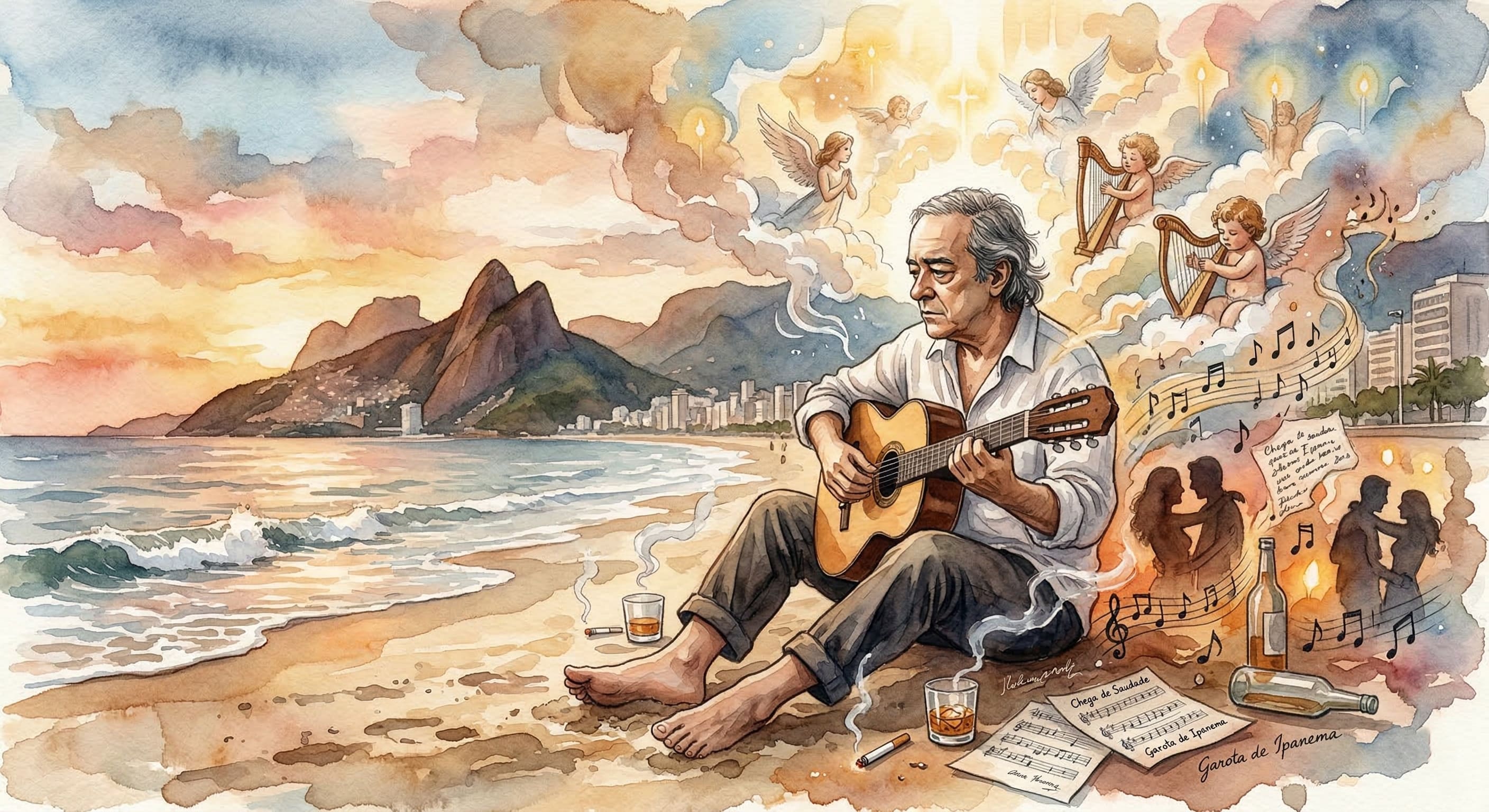 Alt Text: Ilustração em aquarela representando o lirismo em Vinicius de Moraes através da união harmoniosa entre o sagrado e profano nas praias do Rio de Janeiro.