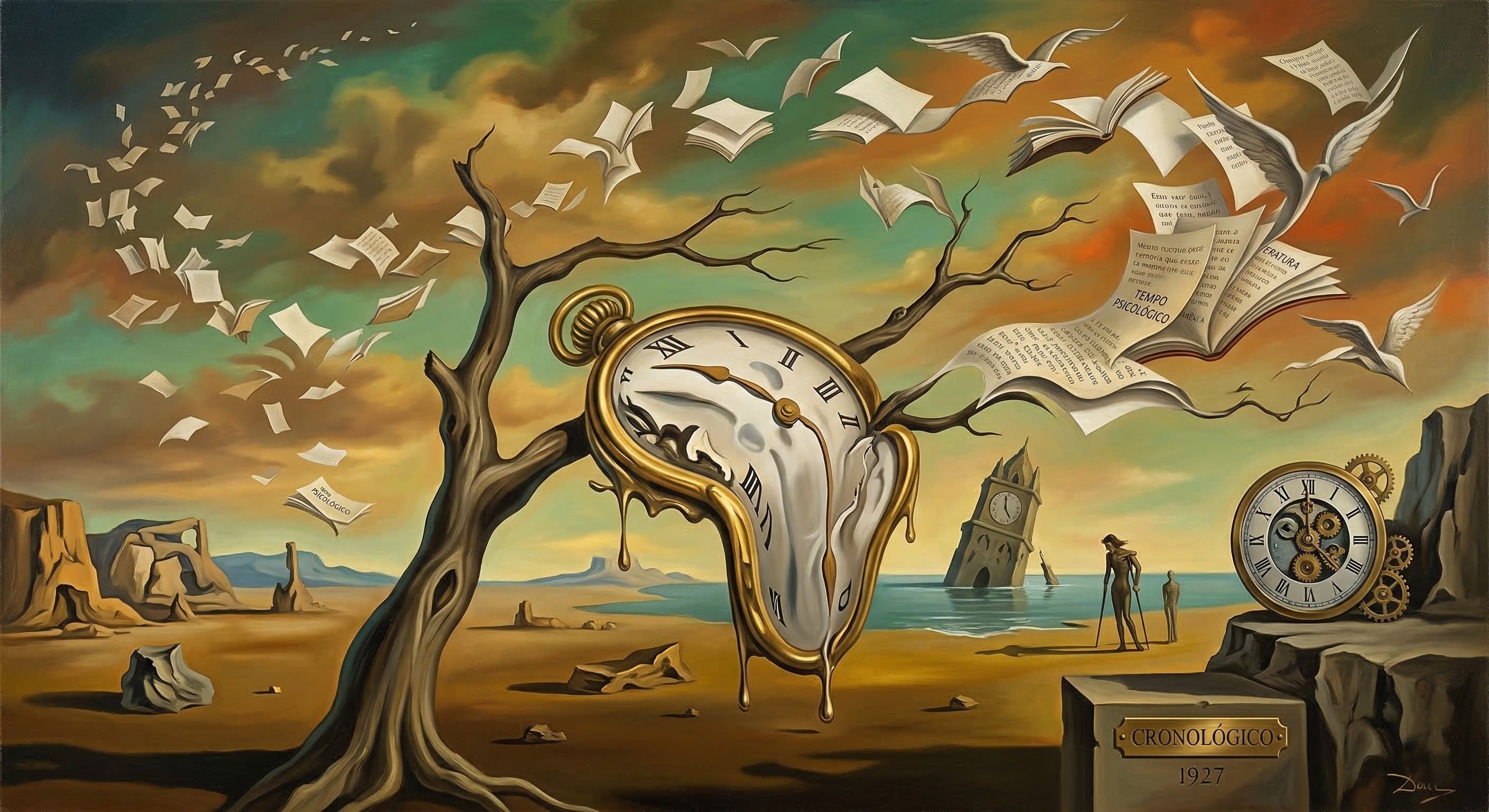 Alt Text: Relógio de bolso derretendo em uma paisagem surreal com páginas de livros voando, simbolizando o tempo psicológico no romance.