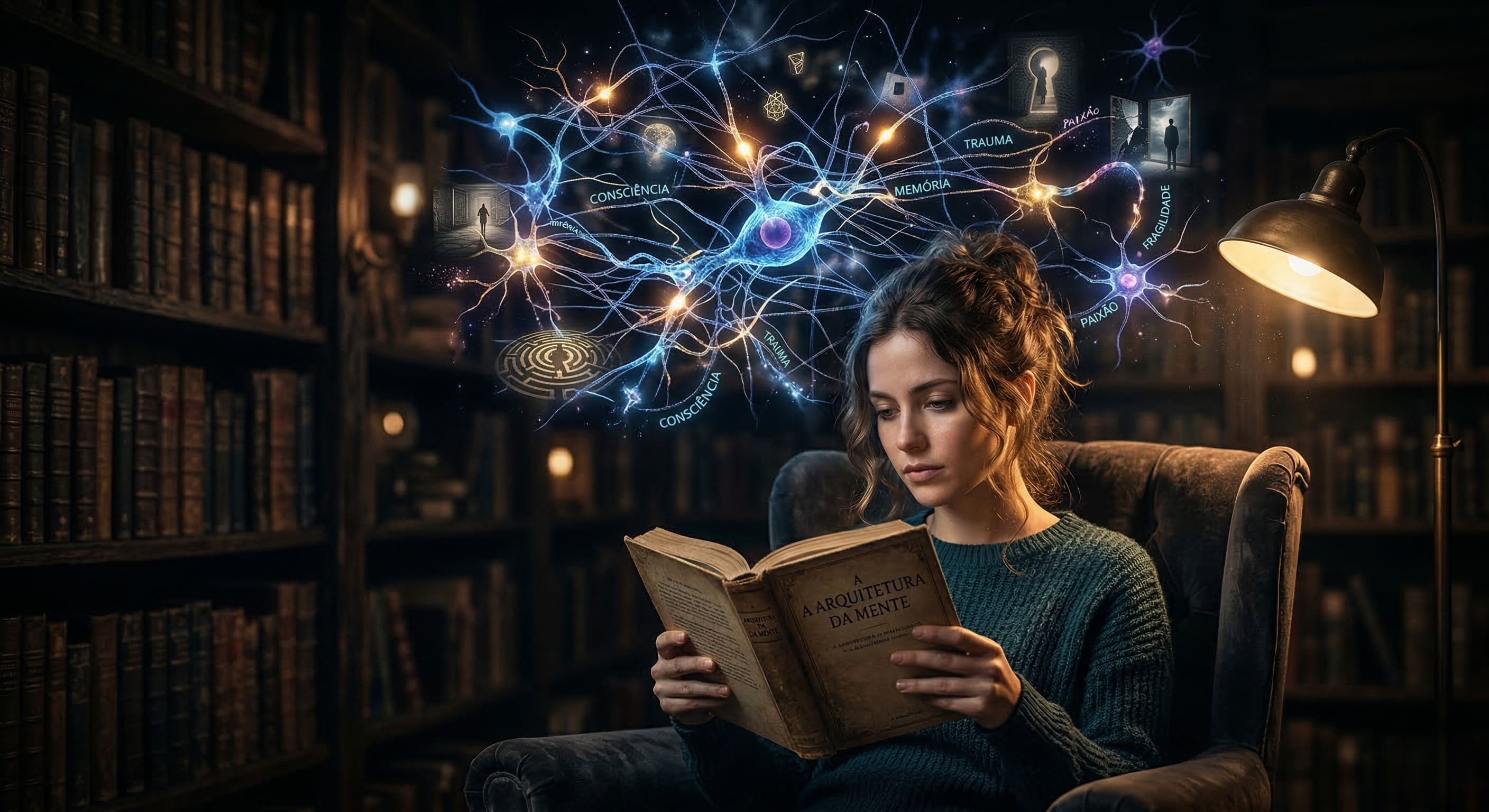 Alt Text : Ilustração de uma pessoa lendo um livro com representações luminosas da mente e pensamentos flutuando, representando o romance psicológico e a complexidade da mente humana.