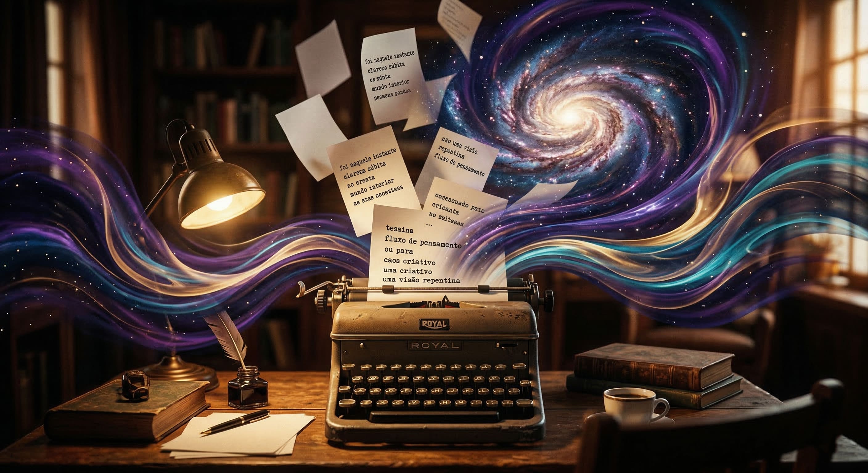 Alt Text: Máquina de escrever antiga com páginas voando e se transformando em ondas abstratas, ilustrando as técnicas literárias do fluxo de consciência e do monólogo interior.