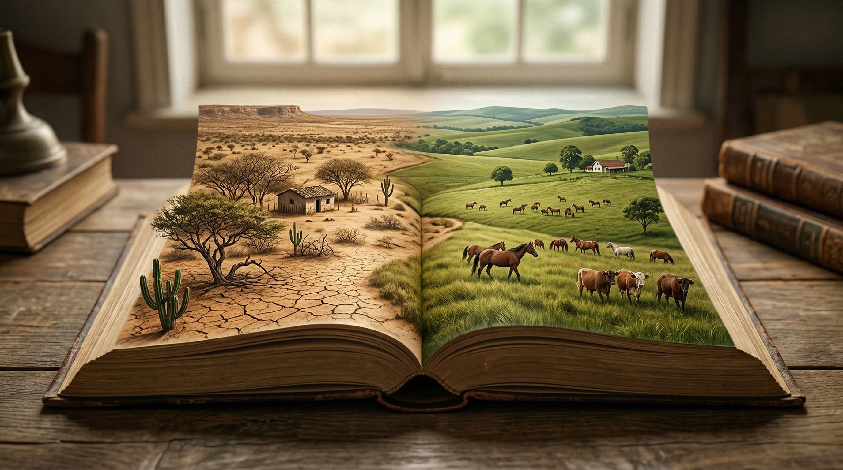 Alt Text (Texto Alternativo): Ilustração realista de um livro aberto do qual emergem diferentes paisagens brasileiras, como o sertão nordestino e os pampas do sul, representando visualmente o regionalismo na prosa brasileira.
