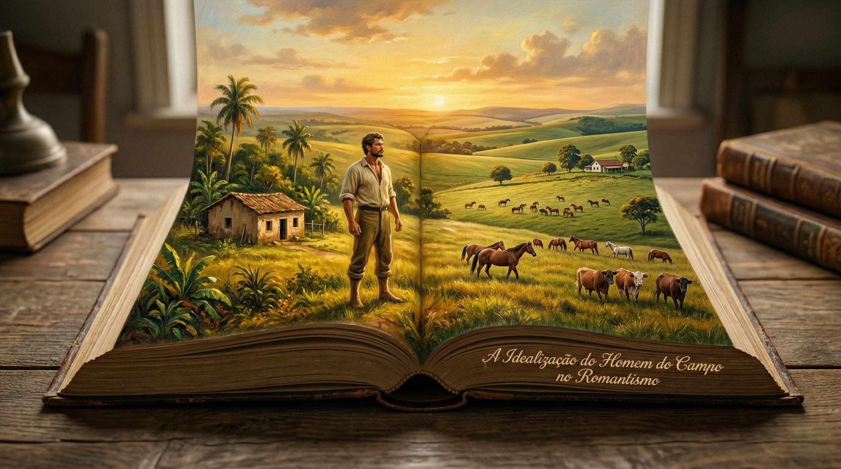 Alt Text (Texto Alternativo): Pintura em estilo clássico de um fazendeiro brasileiro do século XIX olhando para o horizonte, ilustrando a idealização do homem do campo no regionalismo romântico.