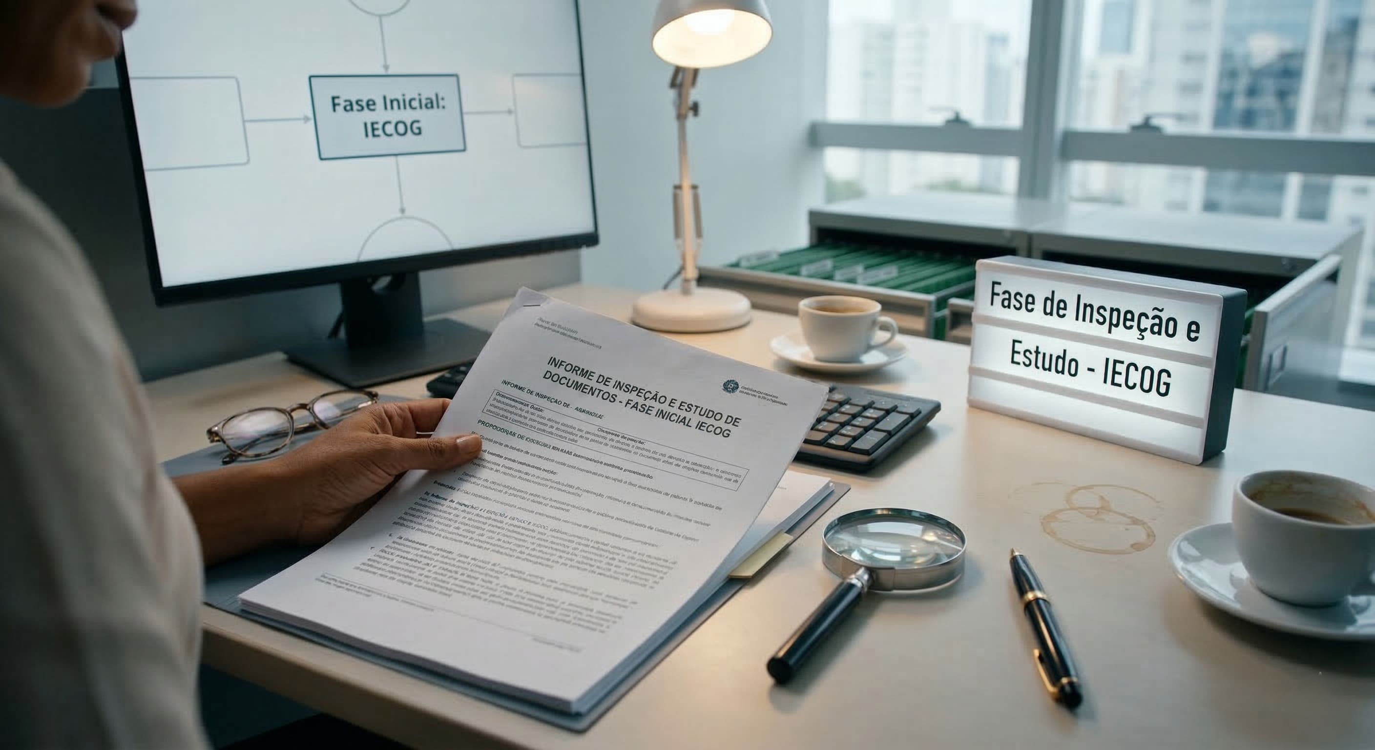 Alt Text: Visão aproximada de uma pessoa inspecionando cuidadosamente um documento formal impresso sobre uma mesa de escritório iluminada, destacando as fases iniciais do método IECOG.