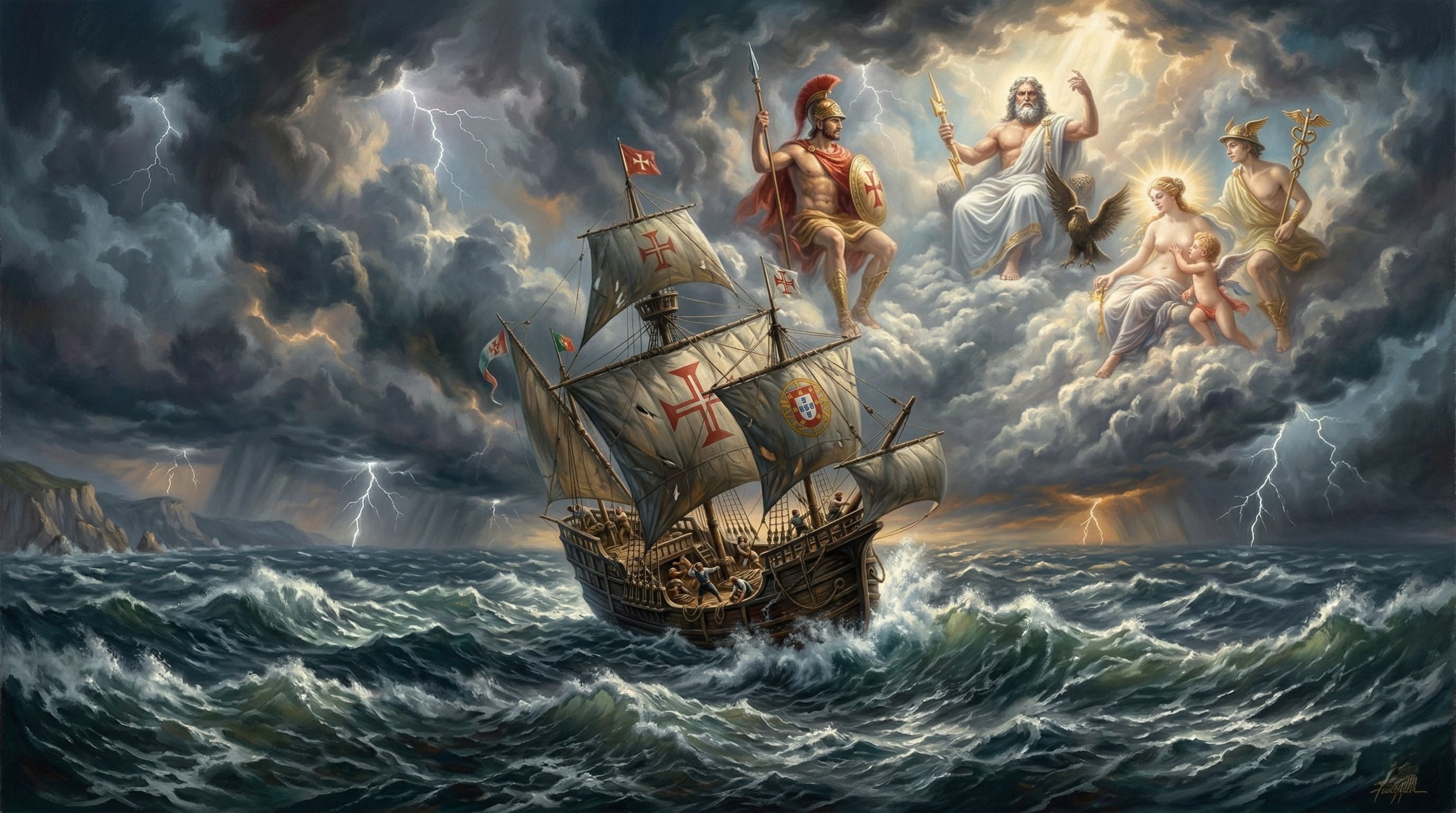 Alt Text: Pintura épica de uma caravela portuguesa no mar agitado com deuses mitológicos no céu, representando a obra Os Lusíadas de Camões.