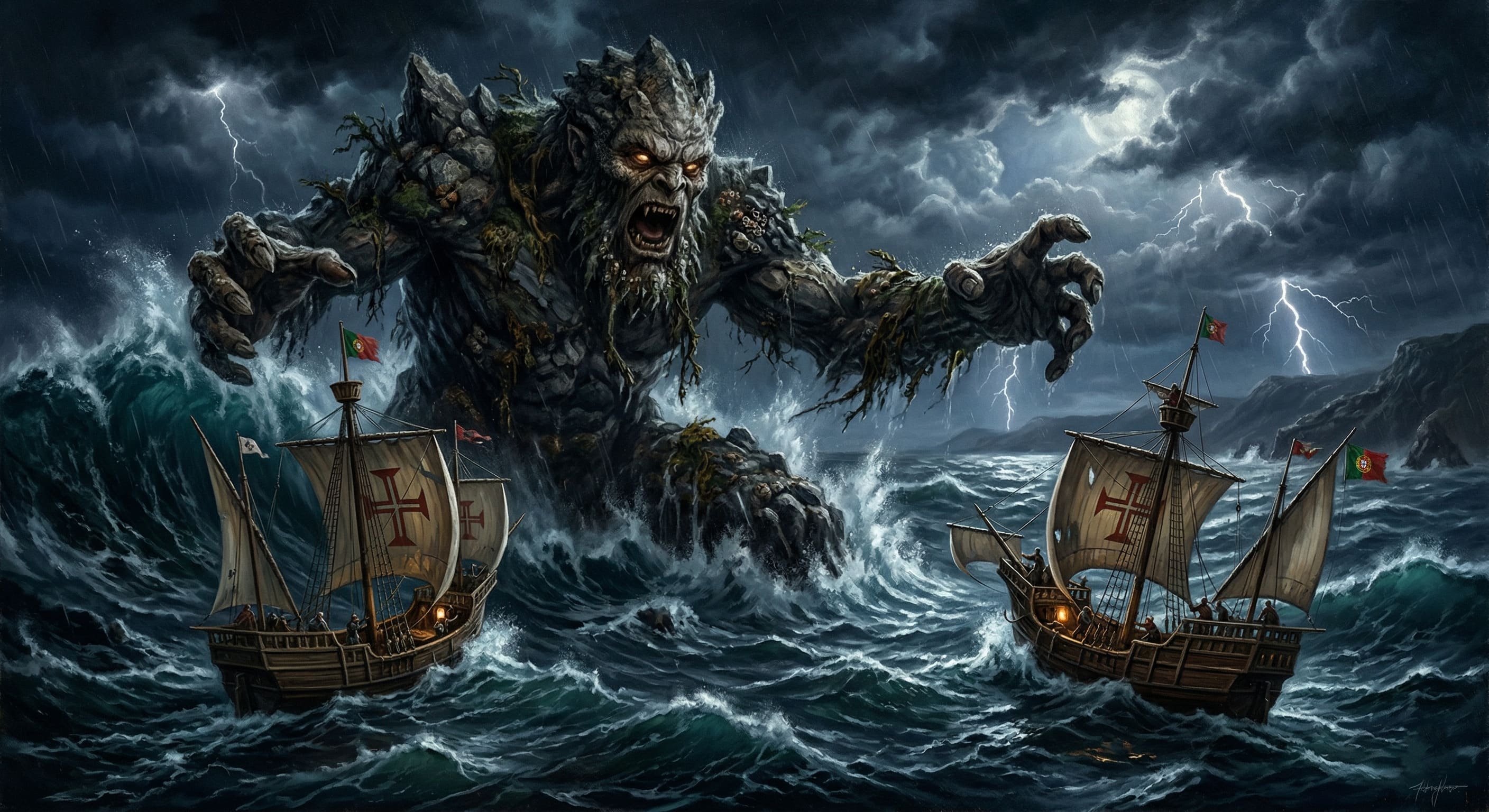 Alt Text: O monstro Gigante Adamastor assombrando as caravelas portuguesas no mar tempestuoso do Cabo das Tormentas.
