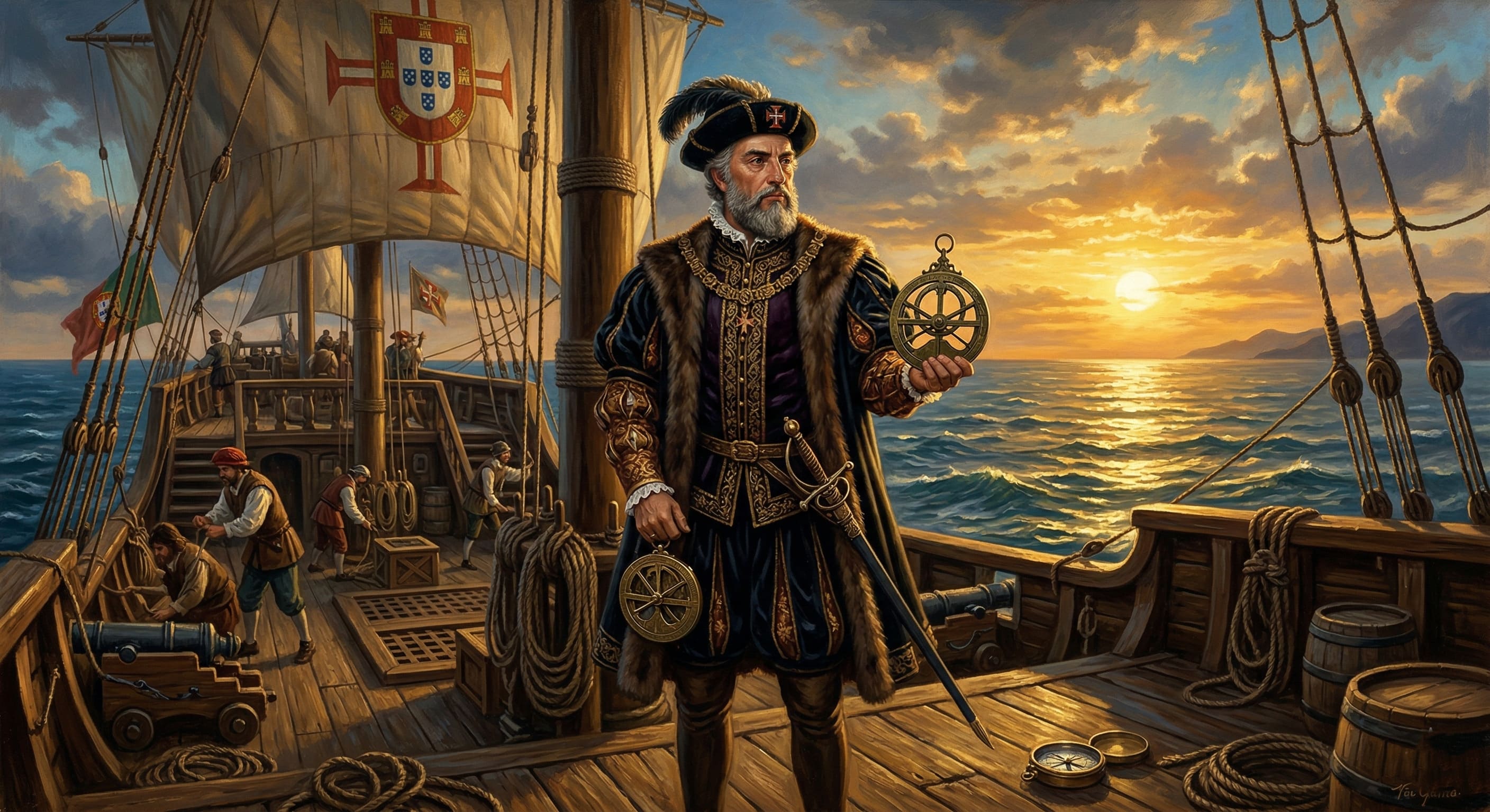 Alt Text: Ilustração de Vasco da Gama no convés de sua caravela segurando um astrolábio, representando a expansão marítima portuguesa em Os Lusíadas.