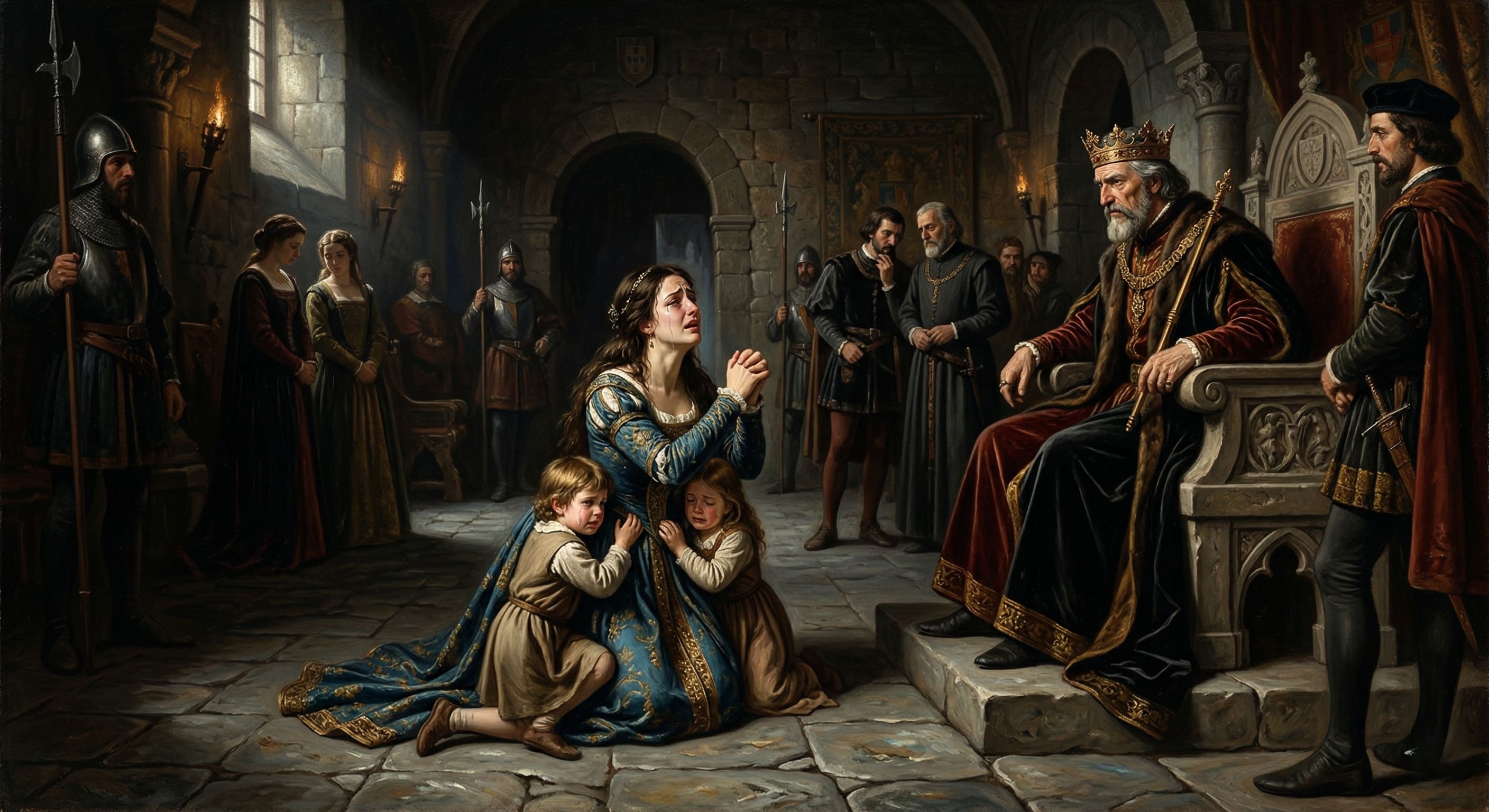 Alt Text: Ilustração de Inês de Castro ajoelhada diante do rei D. Afonso IV, com seus filhos, numa cena trágica de Os Lusíadas.
