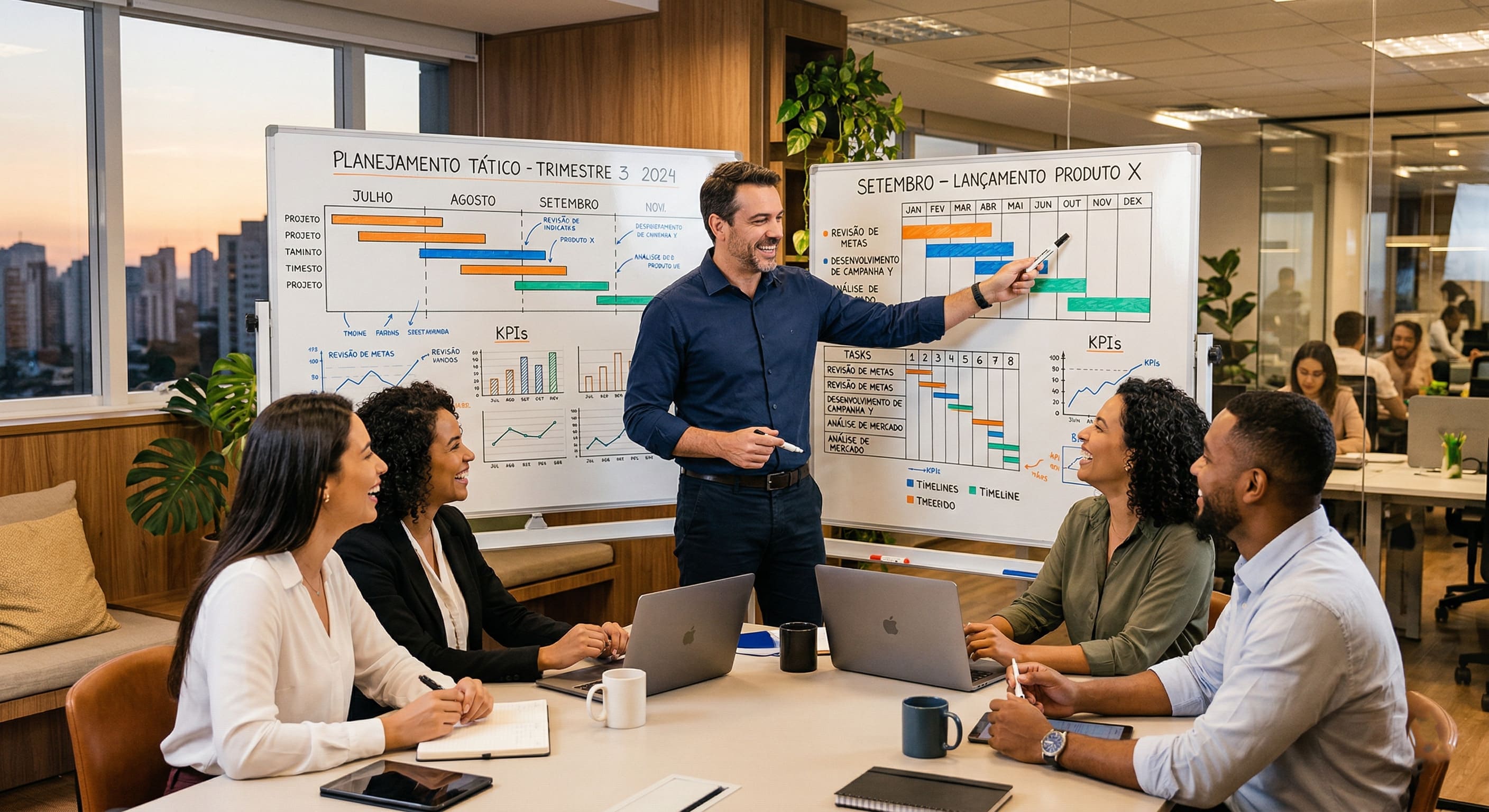 Alt Text: Gerente departamental organizando o planejamento tático em um quadro branco com sua equipe.