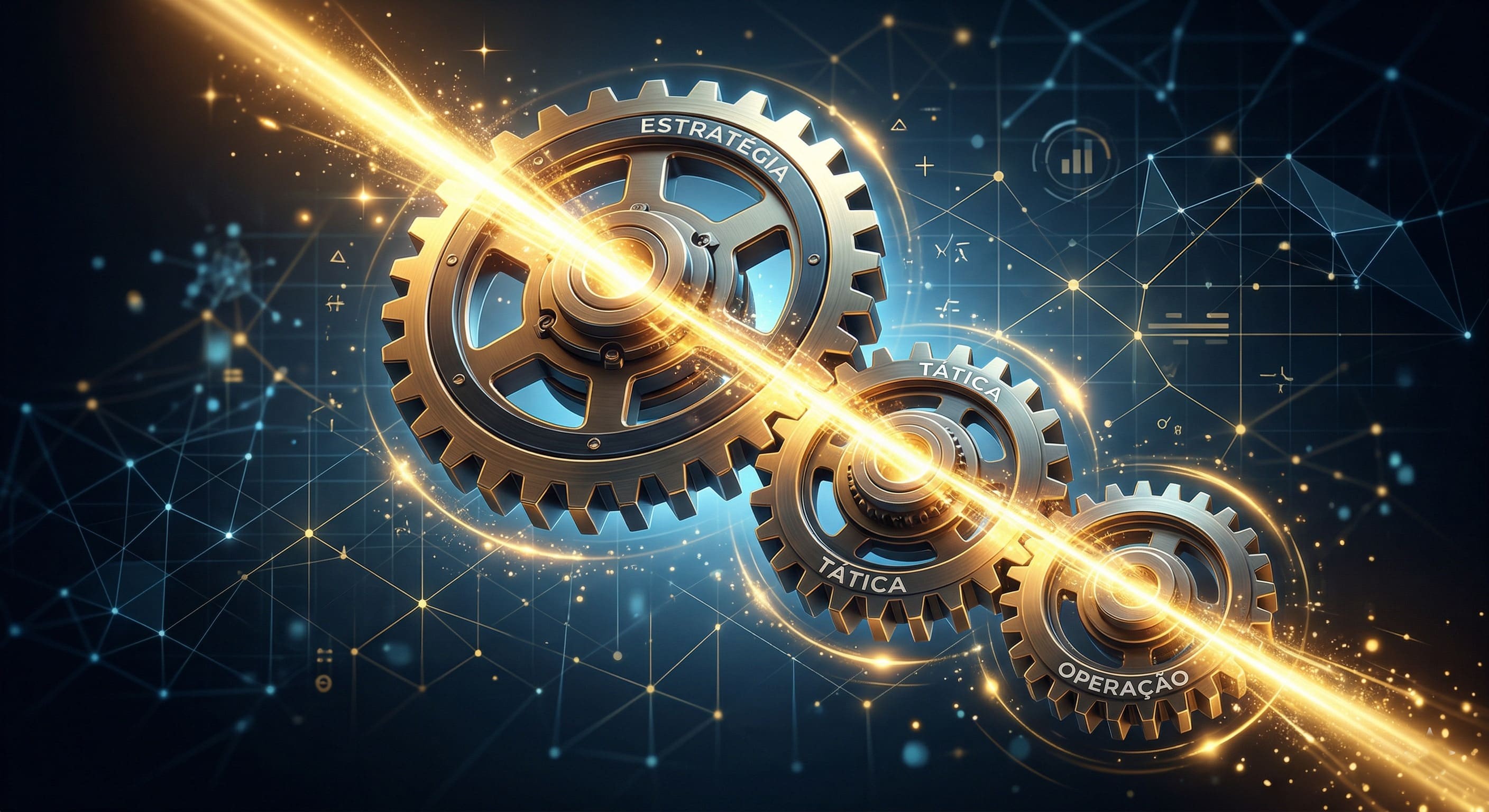 Alt Text: Engrenagens conectadas demonstrando a integração perfeita entre os níveis de planejamento estratégico, tático e operacional.