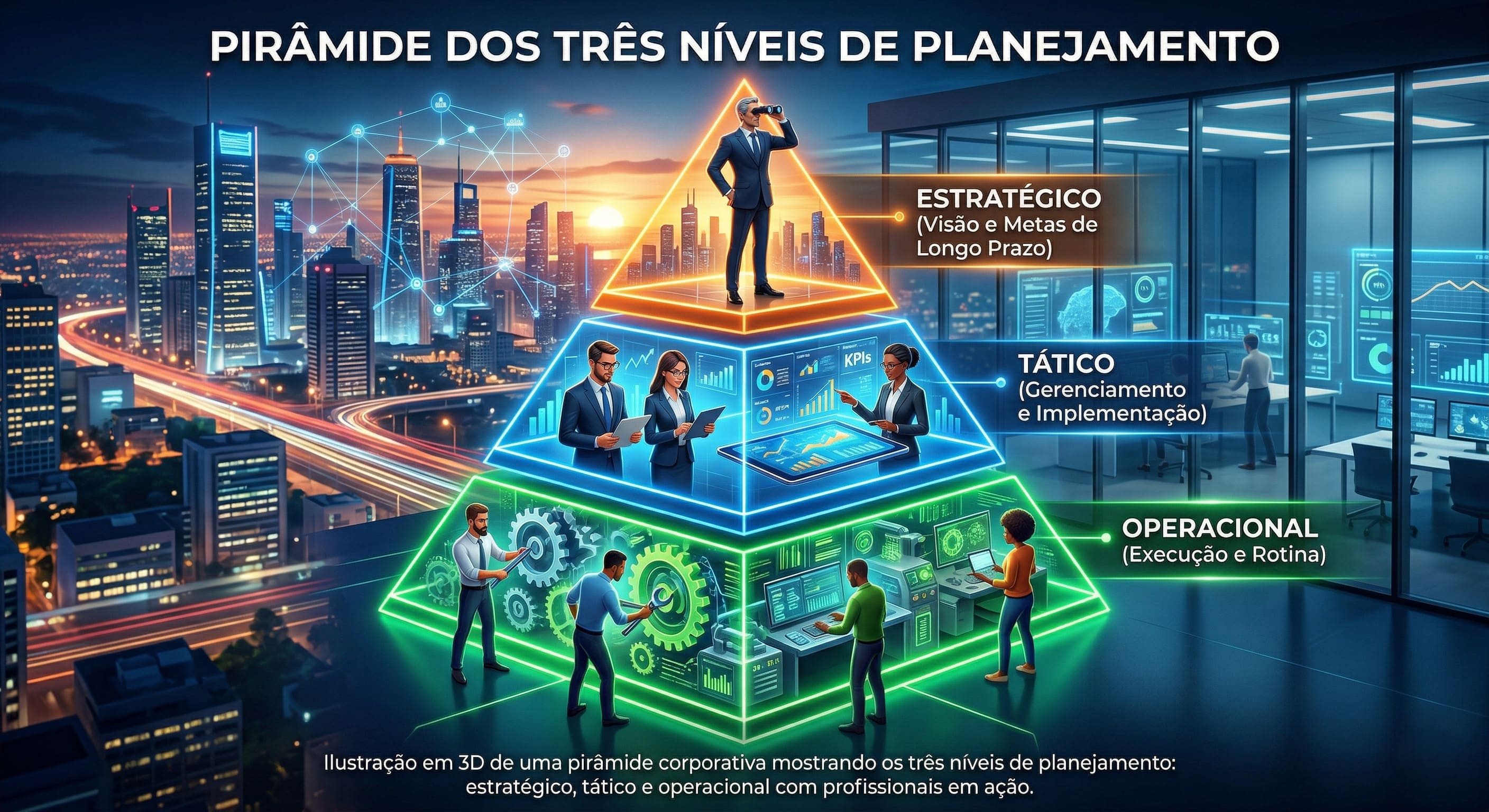 Alt Text: Ilustração em 3D de uma pirâmide corporativa mostrando os três níveis de planejamento: estratégico, tático e operacional com profissionais em ação.