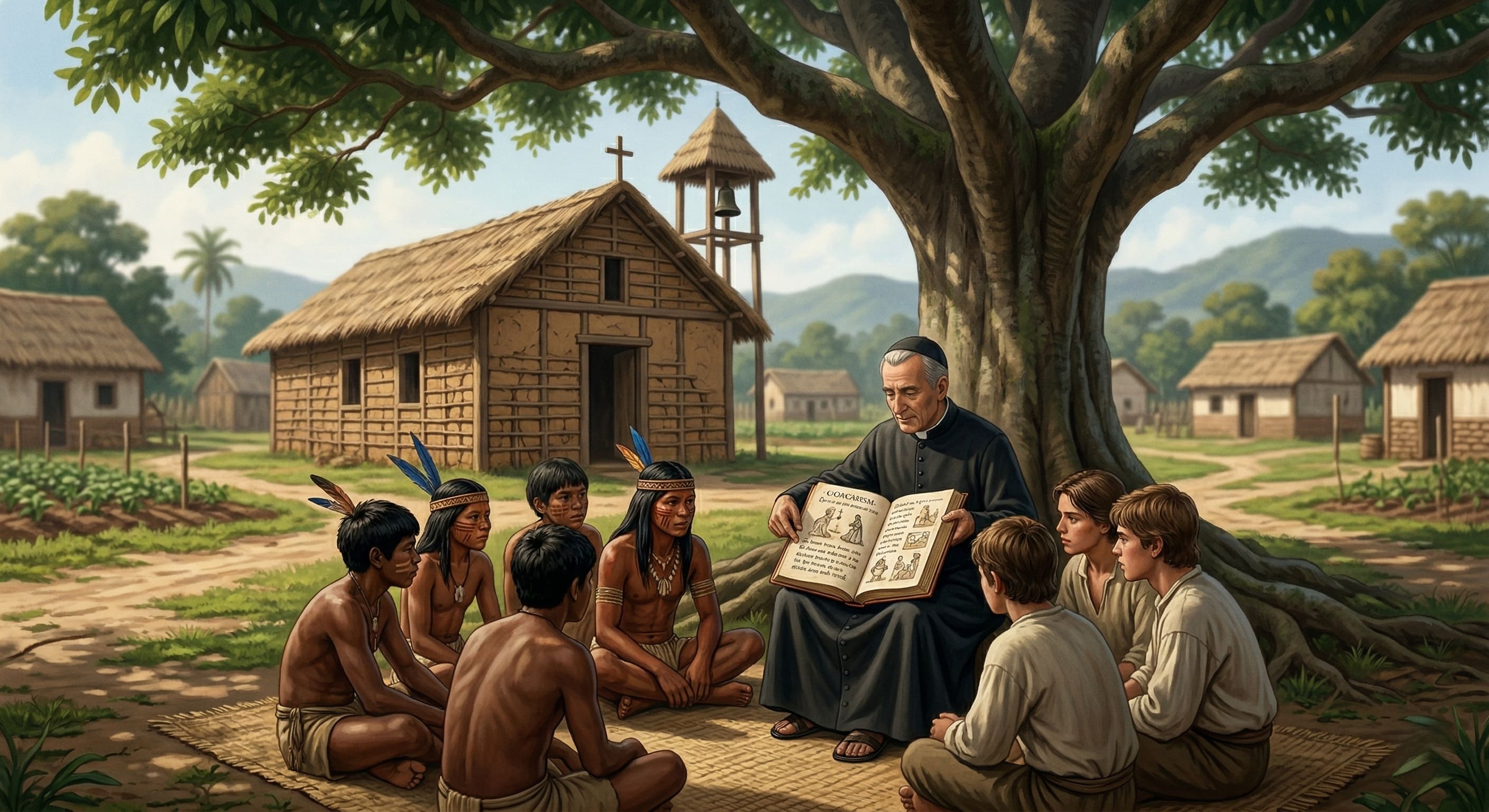 Alt Text: Padres jesuítas ensinando indígenas e colonos em uma missão no Brasil colônia.