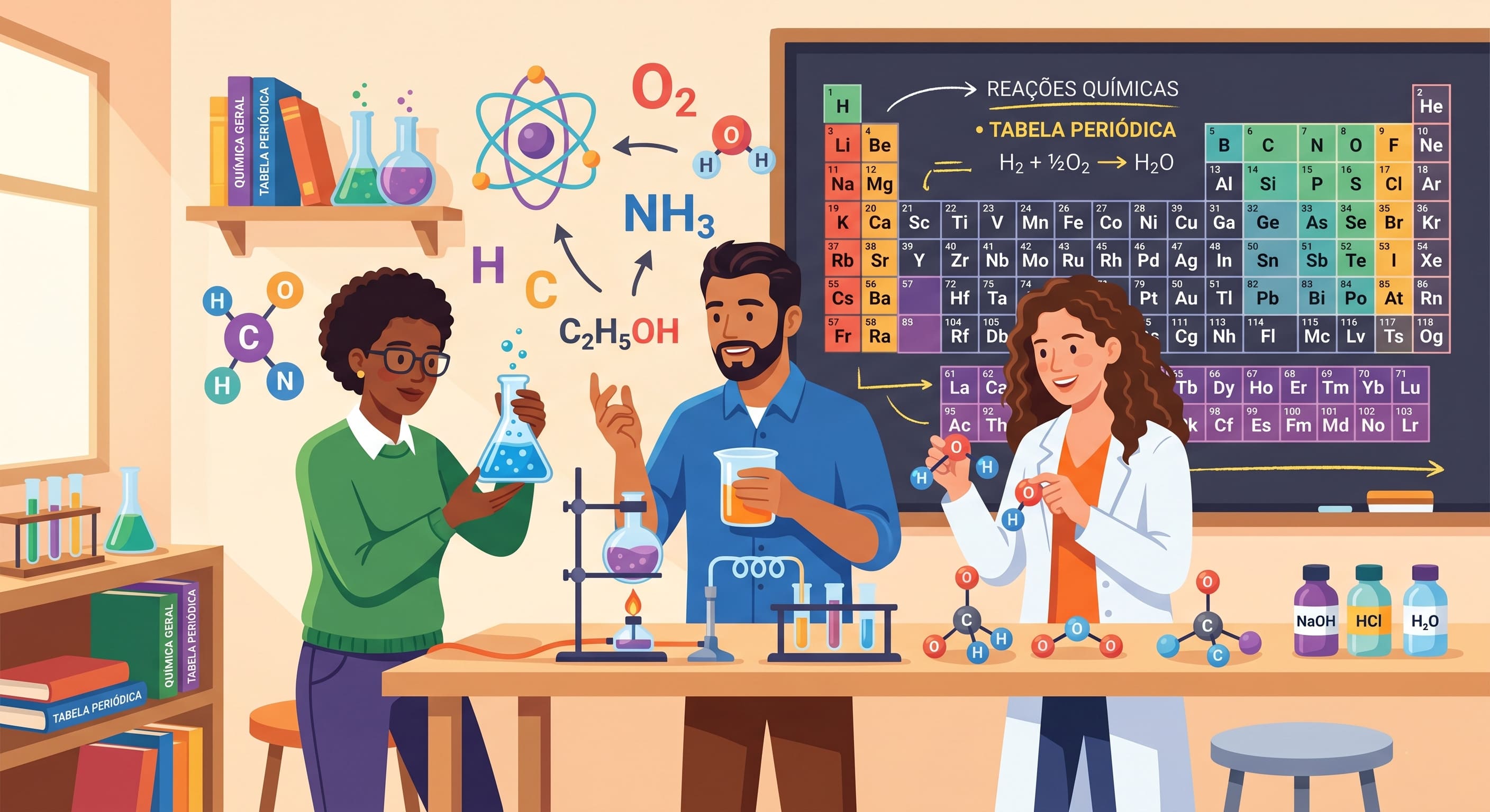 Alt text: Ilustração de estudantes adultos aprendendo conceitos químicos, acompanhados de vidrarias de laboratório e uma tabela periódica ao fundo.