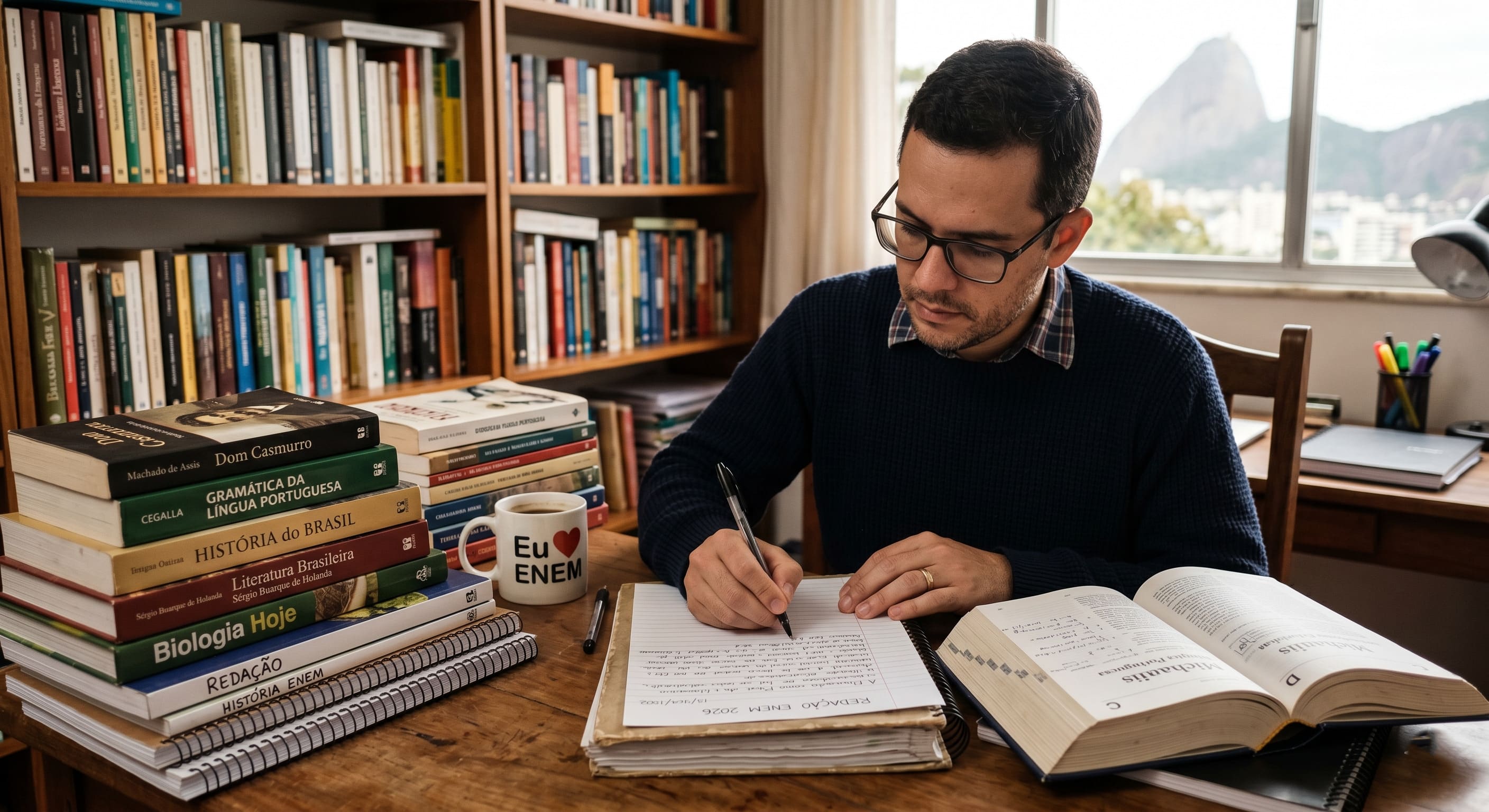 Alt text acessível: Estudante adulto escrevendo uma redação à mão em um ambiente de estudos organizado com livros, ilustrando o foco e a dedicação na preparação para o Enem e vestibulares.