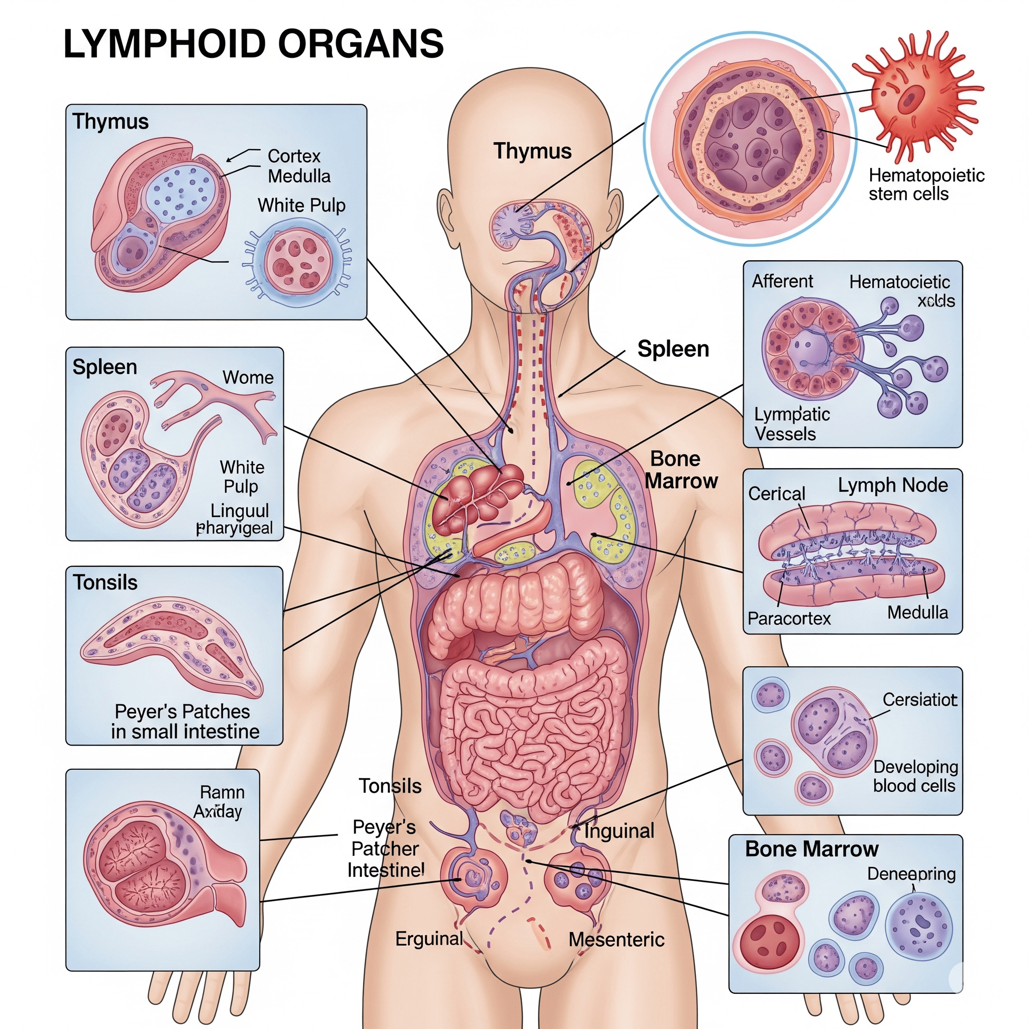 O sistema imunológico é composto por diversos órgãos, além de células e moléculas dispersas por todo o corpo. Esses órgãos são essenciais para a produção, maturação e encontro das células imunes com os antígenos. Eles são classificados em órgãos linfoides primários e órgãos linfoides secundários.