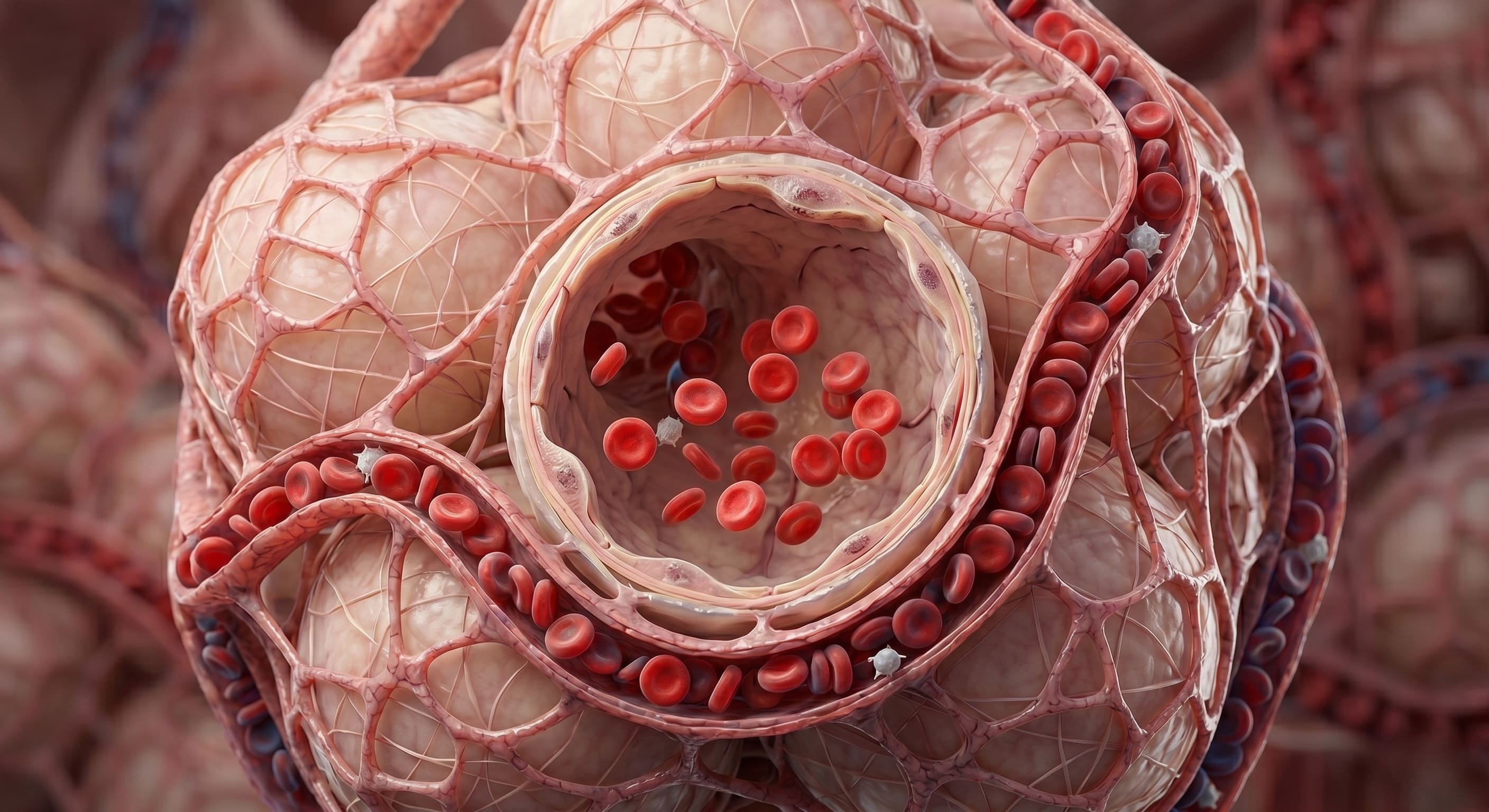 Alt text: Alvéolos pulmonares e capilares onde ocorre a hematose nos sistemas do corpo humano respiratório.