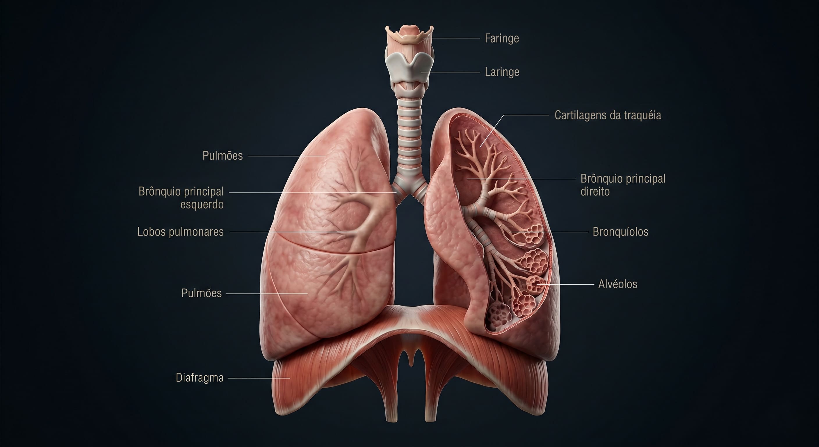 Alt text: Ilustração 3D dos sistemas do corpo humano respiratório, mostrando pulmões, traqueia e diafragma.