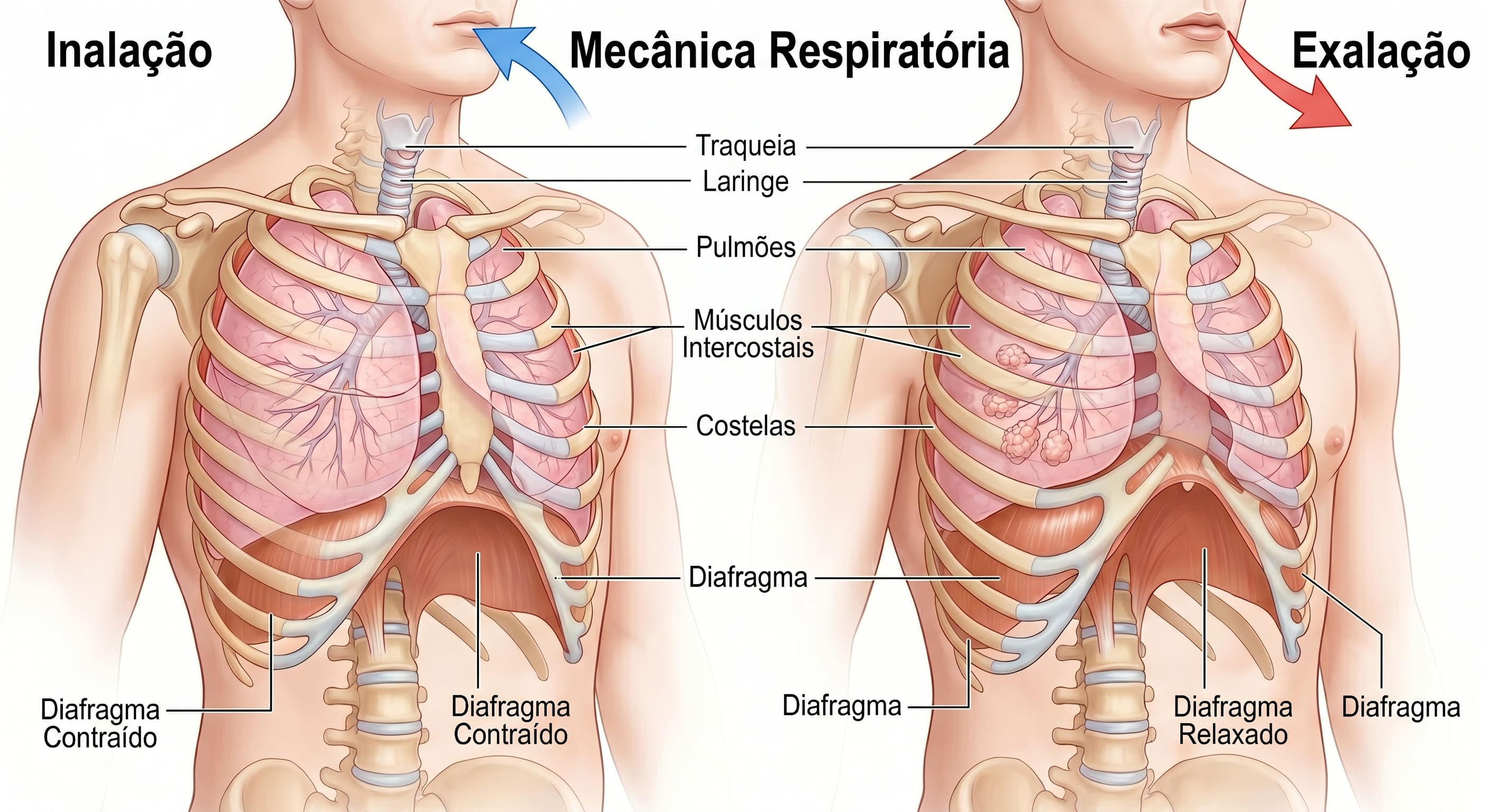 A respiração ocorre por diferença de pressão. Compare com uma seringa: quando você puxa o êmbolo (diafragma desce), o espaço interno aumenta, a pressão cai, e o ar é sugado para dentro.