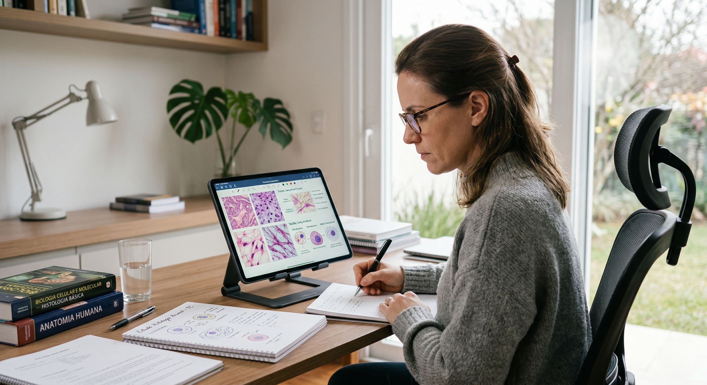 Alt text: Estudante adulto focado aprendendo sobre tecidos animais conjuntivo através de um tablet.