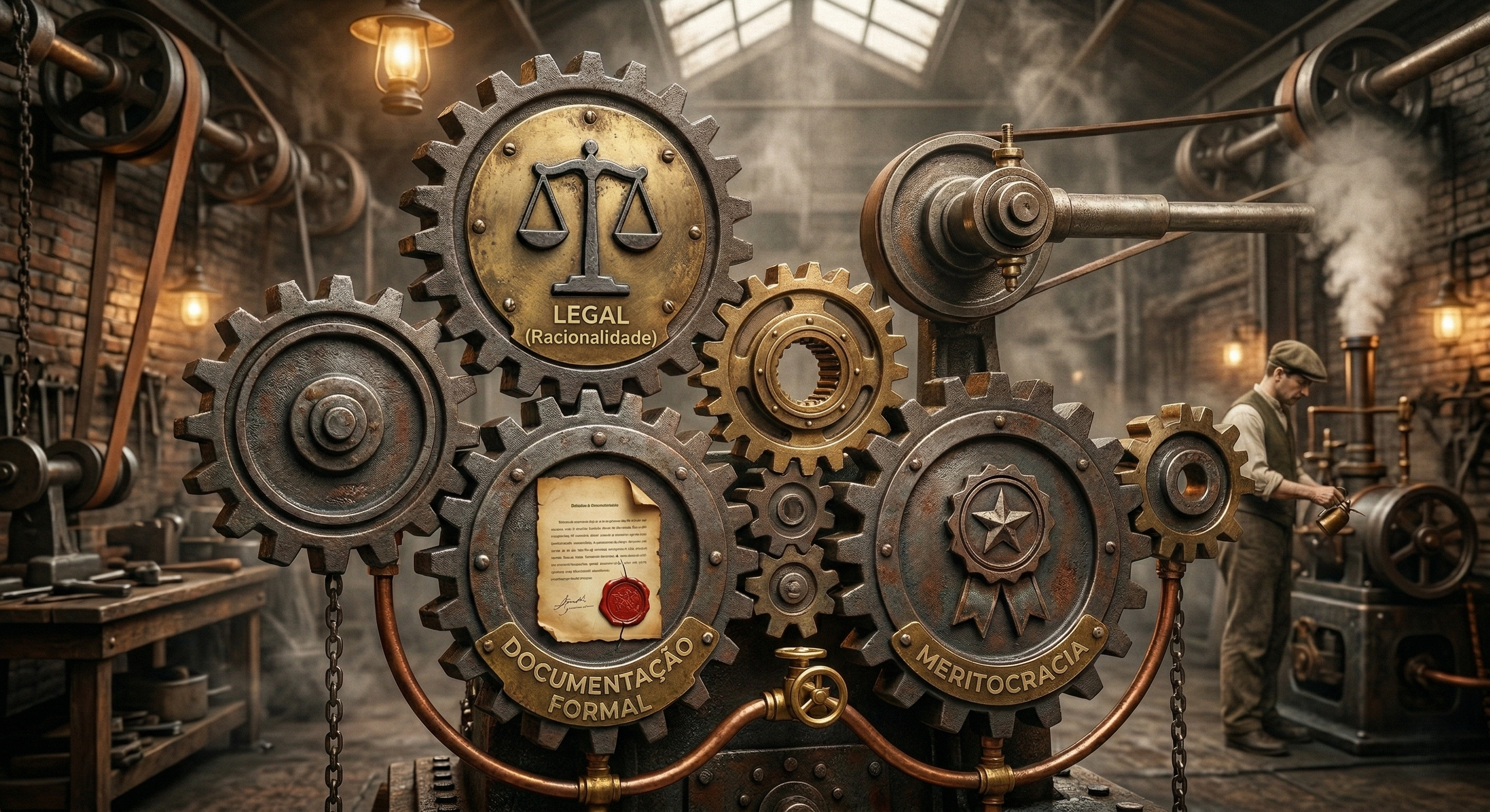 Alt Text: Ilustração de engrenagens perfeitamente alinhadas com ícones de balança, documento e medalha, representando as características de meritocracia e racionalidade da burocracia.