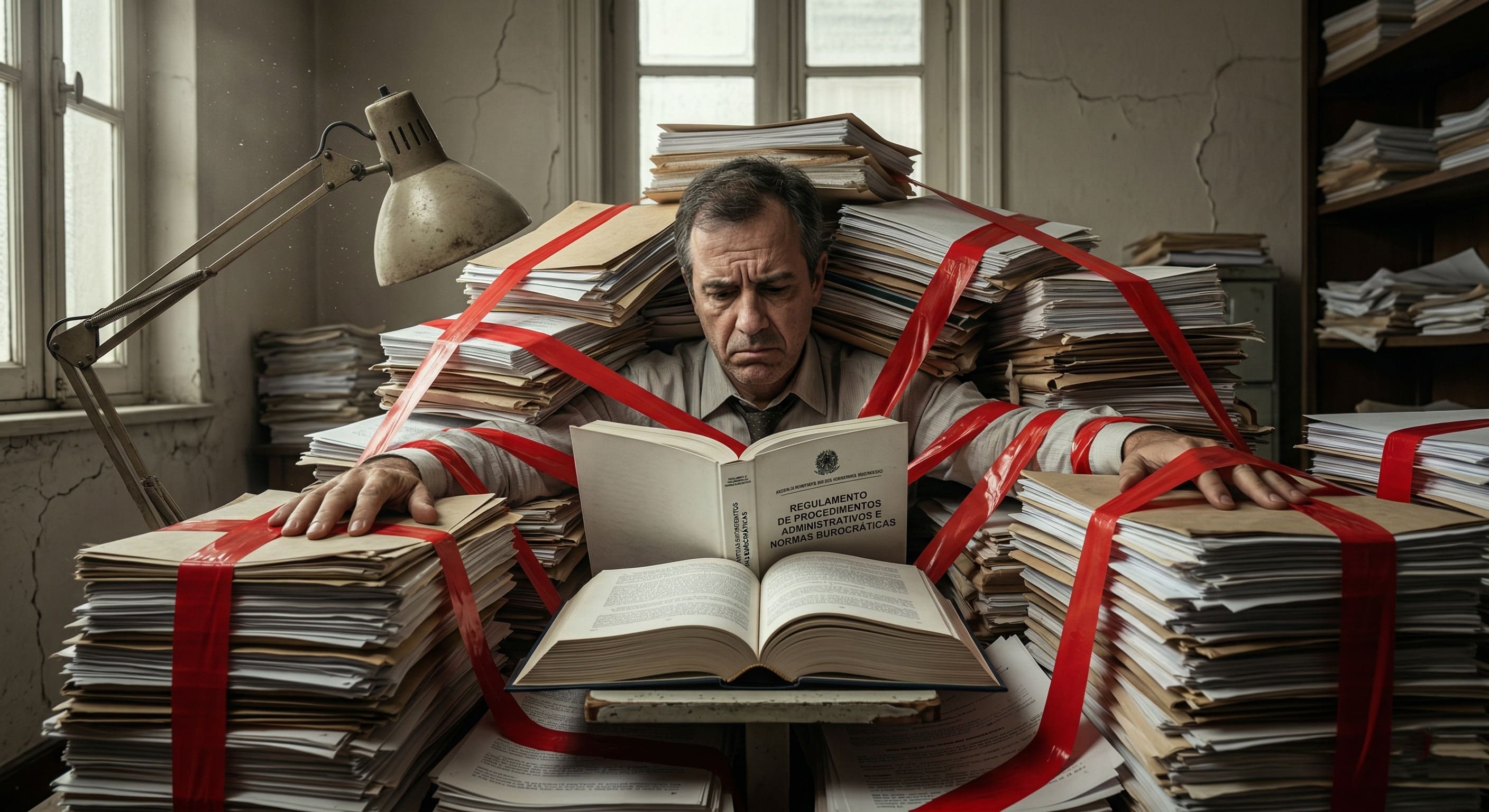 Alt Text: Trabalhador de escritório frustrado e submerso em uma montanha de papéis e fitas vermelhas, ilustrando o excesso de papelório e as disfunções da burocracia.